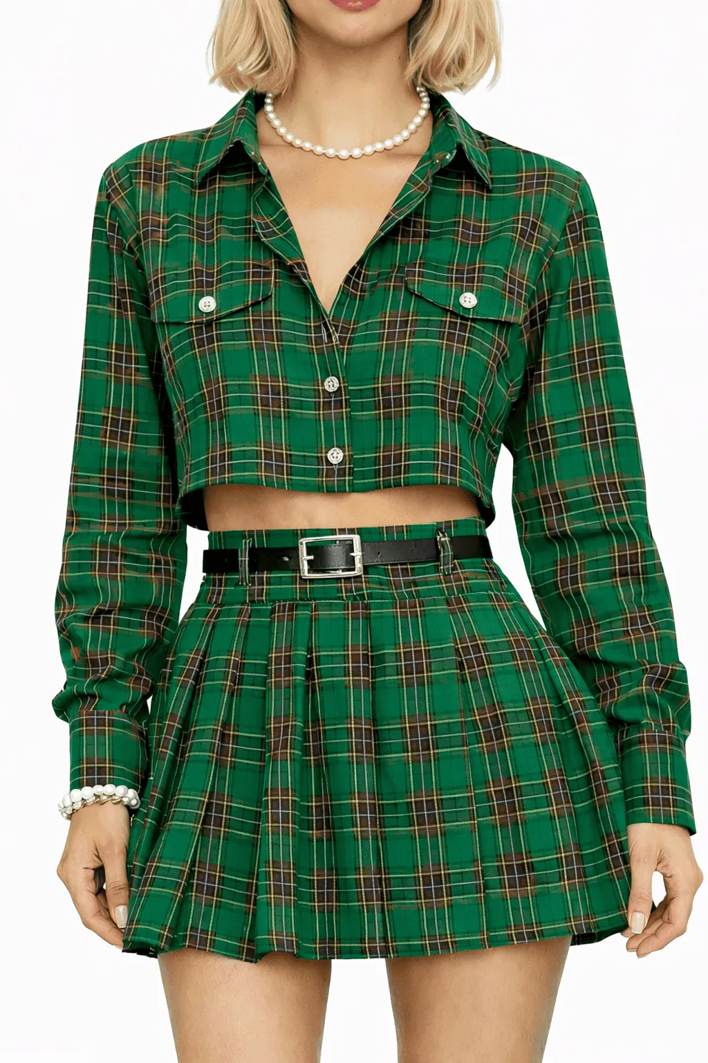 The MDU406US is a sophisticated two-piece set defined by its structured cotton construction and timeless green plaid pattern. Combining a modern cropped utility shirt with a classic pleated skirt, it offers a polished and youthful approach to holiday style.