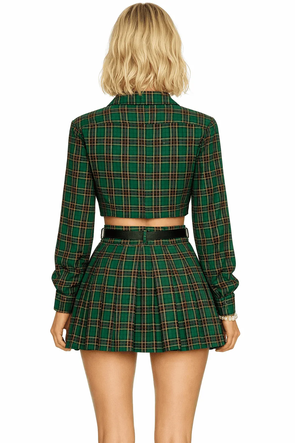 Back View: The high-quality cotton plaid pattern continues seamlessly across the back of both the cropped shirt and the pleated skirt, maintaining a cohesive and polished 360-degree look.