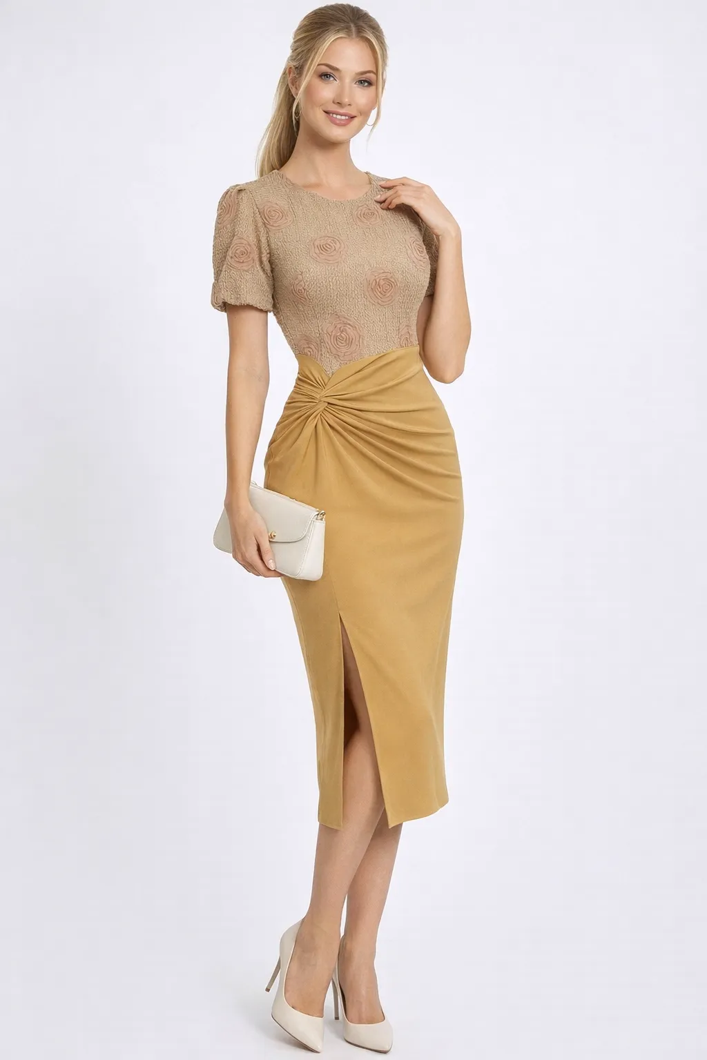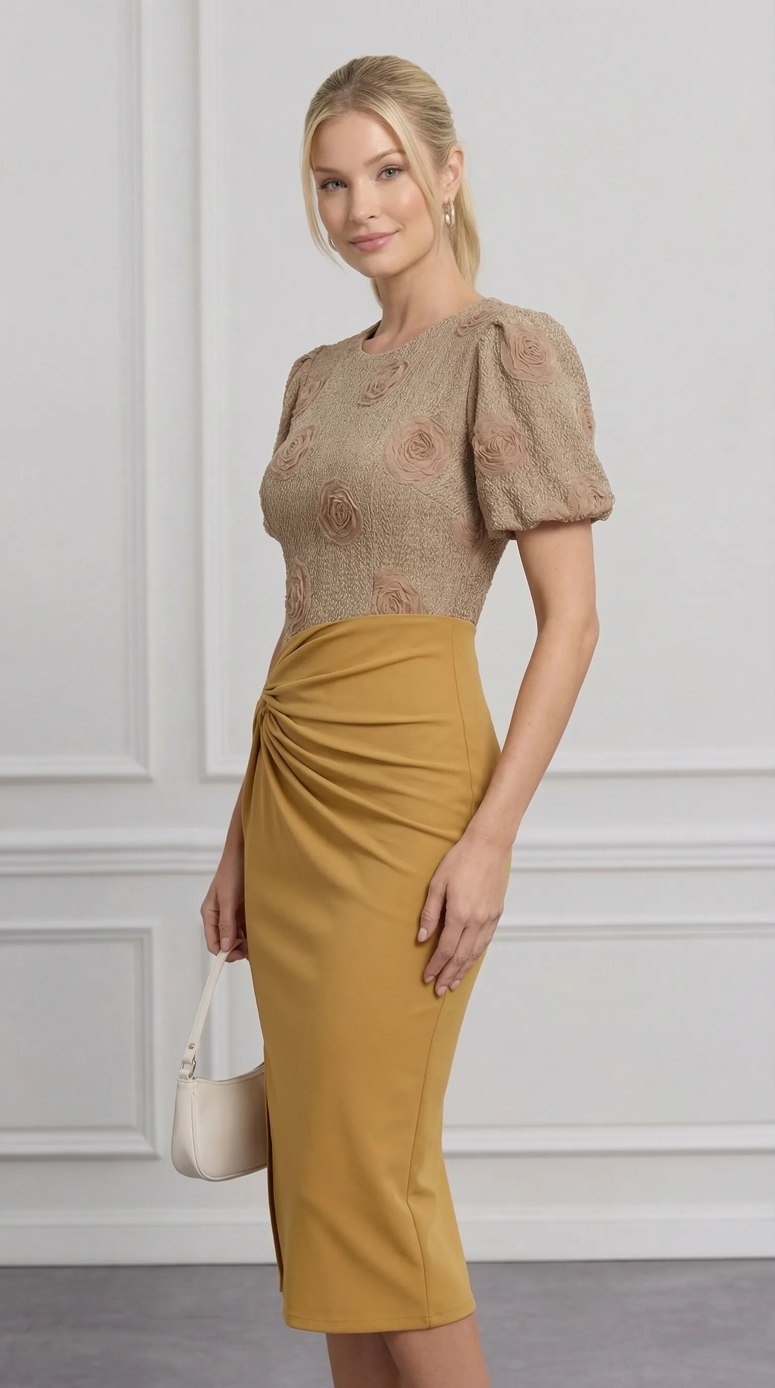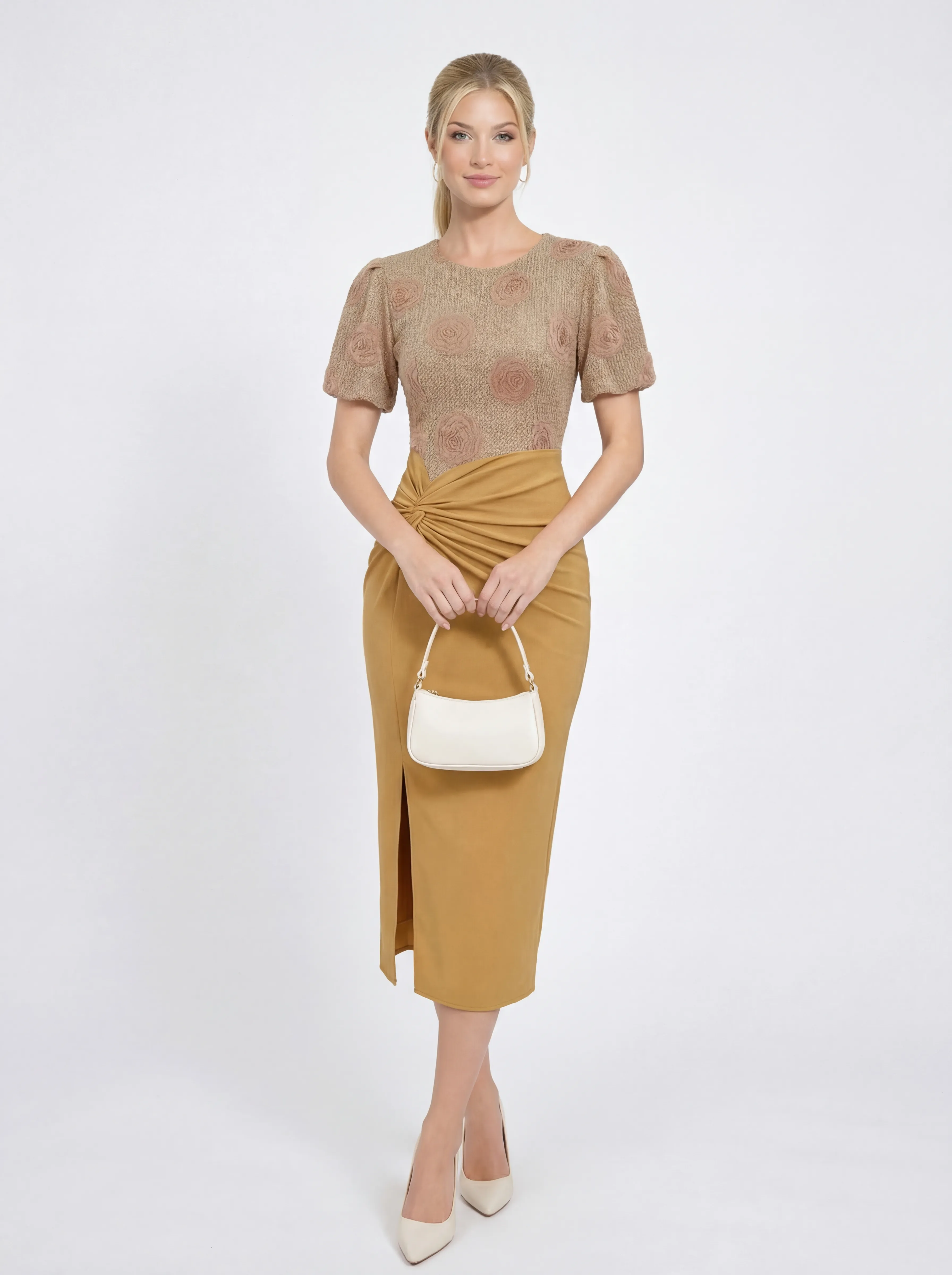 The MDU5900 is the epitome of feminine power, combining the romantic texture of dimensional lace with a precision-tailored Korean Xleo skirt. With its flattering form-fitting silhouette and graceful puff sleeves, this amber brown midi offers a polished and regal statement for your most important social milestones.