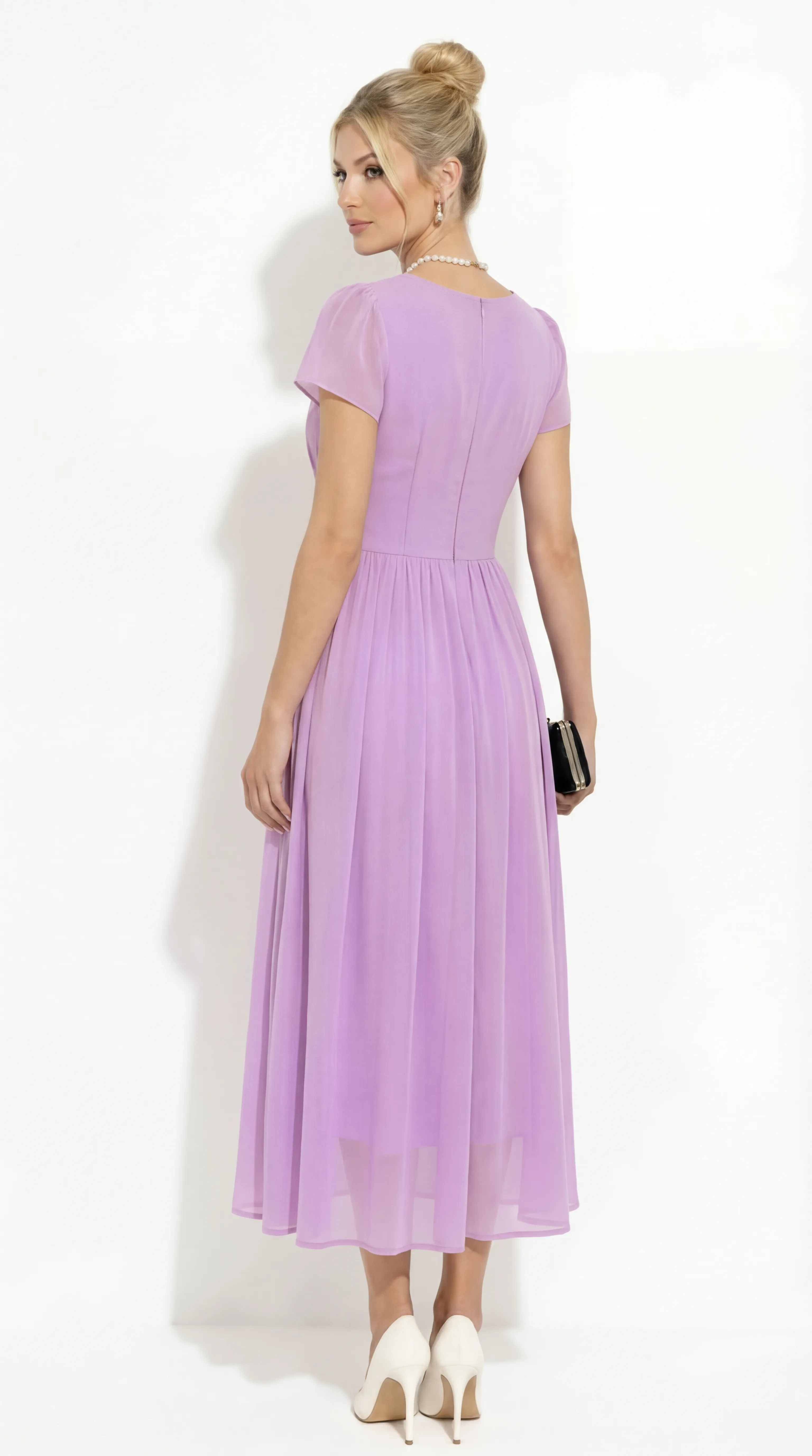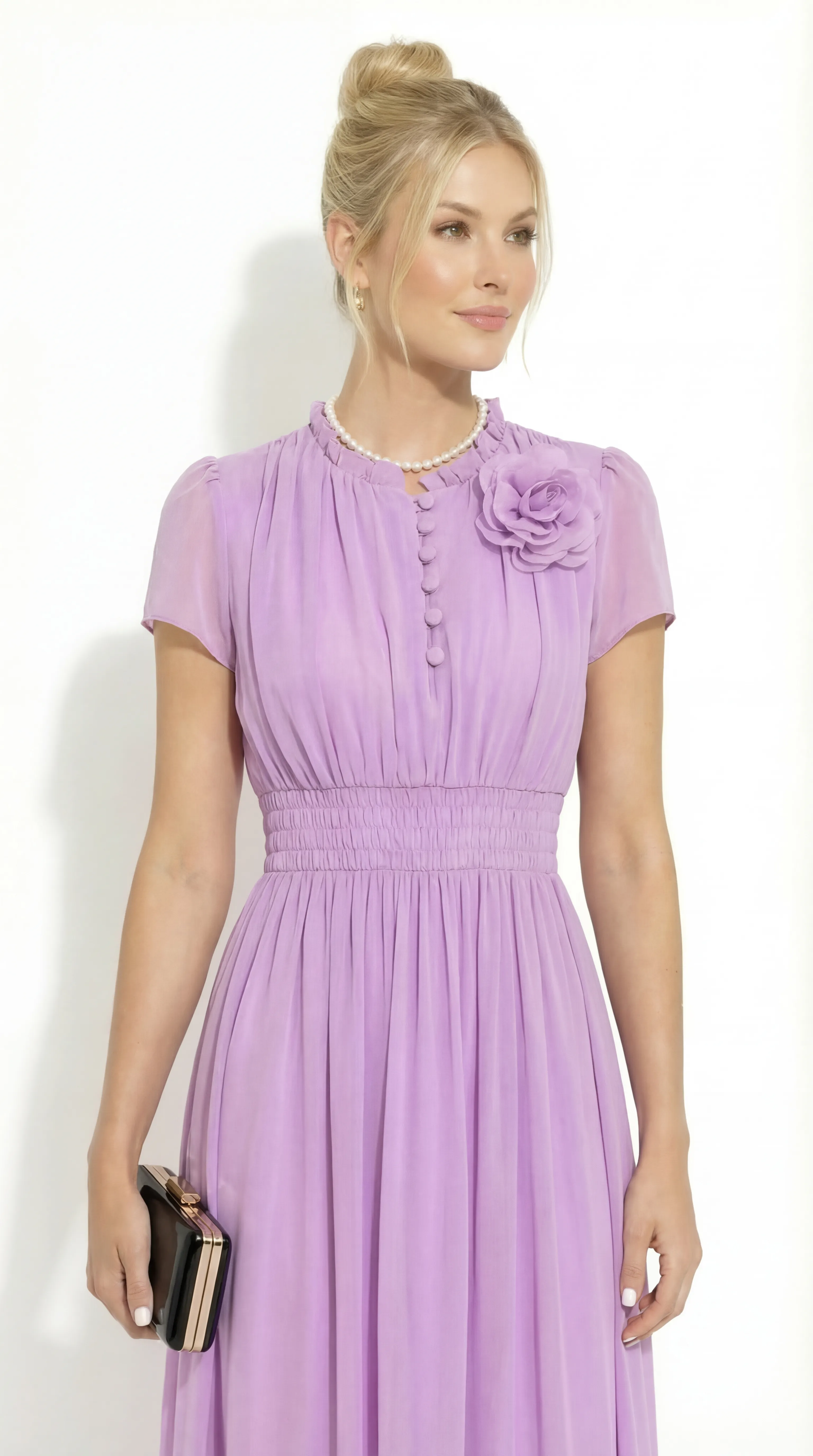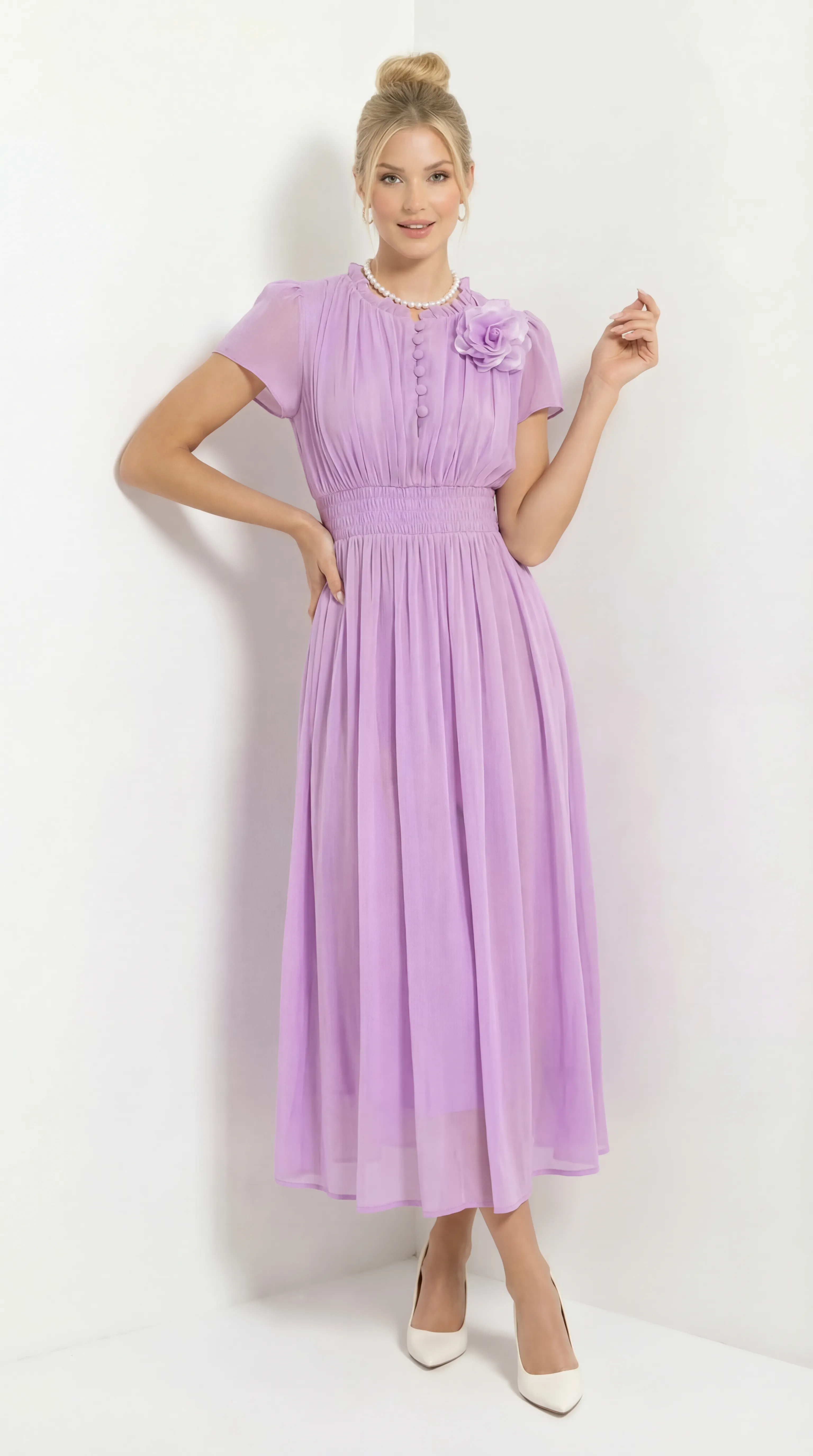 The MDU4233 is a vision of graceful femininity, combining the radiant texture of Korean silk with artisanal 3D floral detailing. With its flattering pleated bodice and fluid flared skirt, this lavender midi offers a polished and ethereal silhouette for any high-end occasion.
