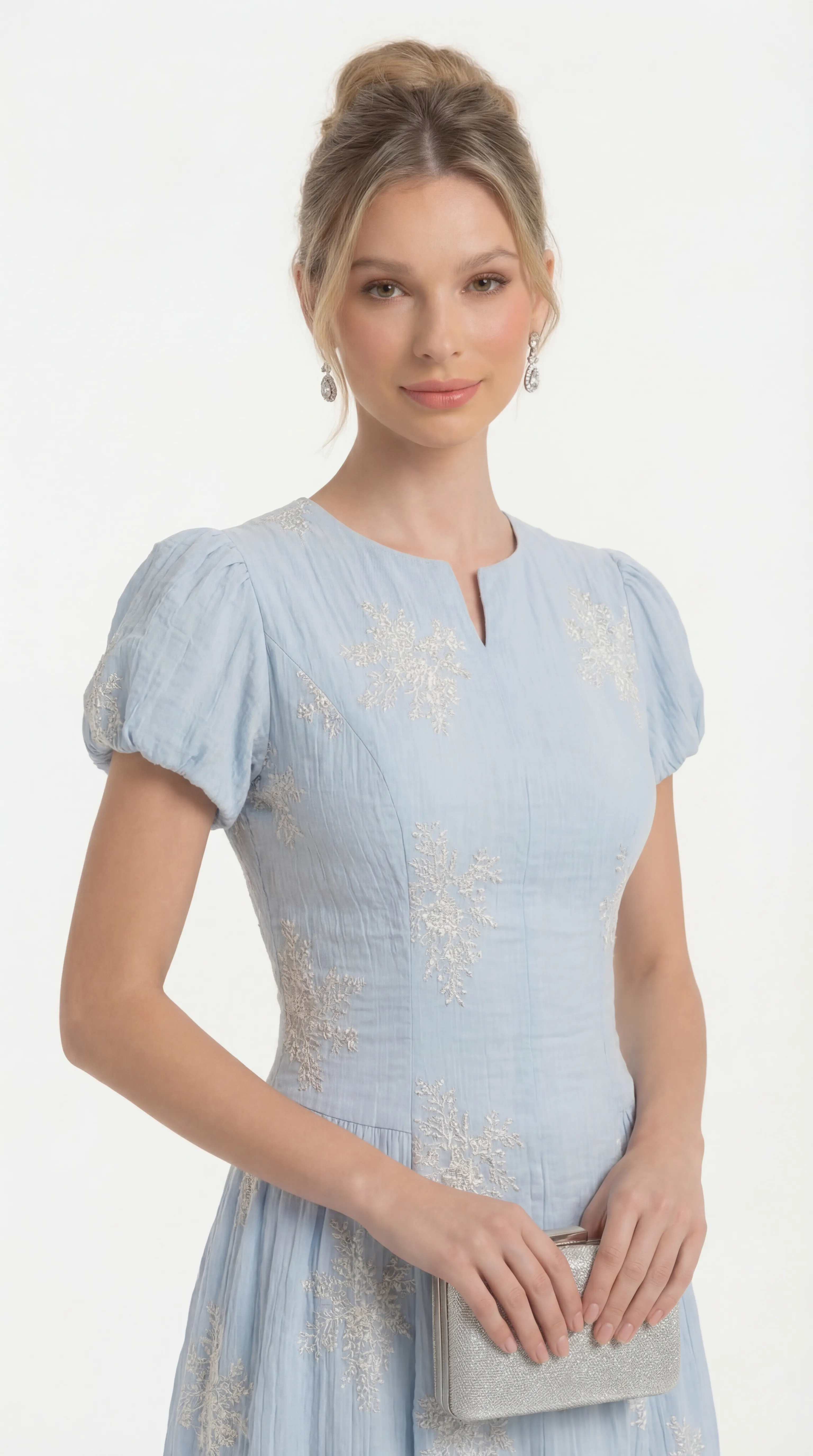 The MDU4735 is a vision of soft femininity, blending the rich texture of embroidered silk with a refined, modern silhouette. With its graceful V-slit neckline and breathable two-layer construction, this sky-blue midi offers a sophisticated and comfortable statement for the office or special occasions.