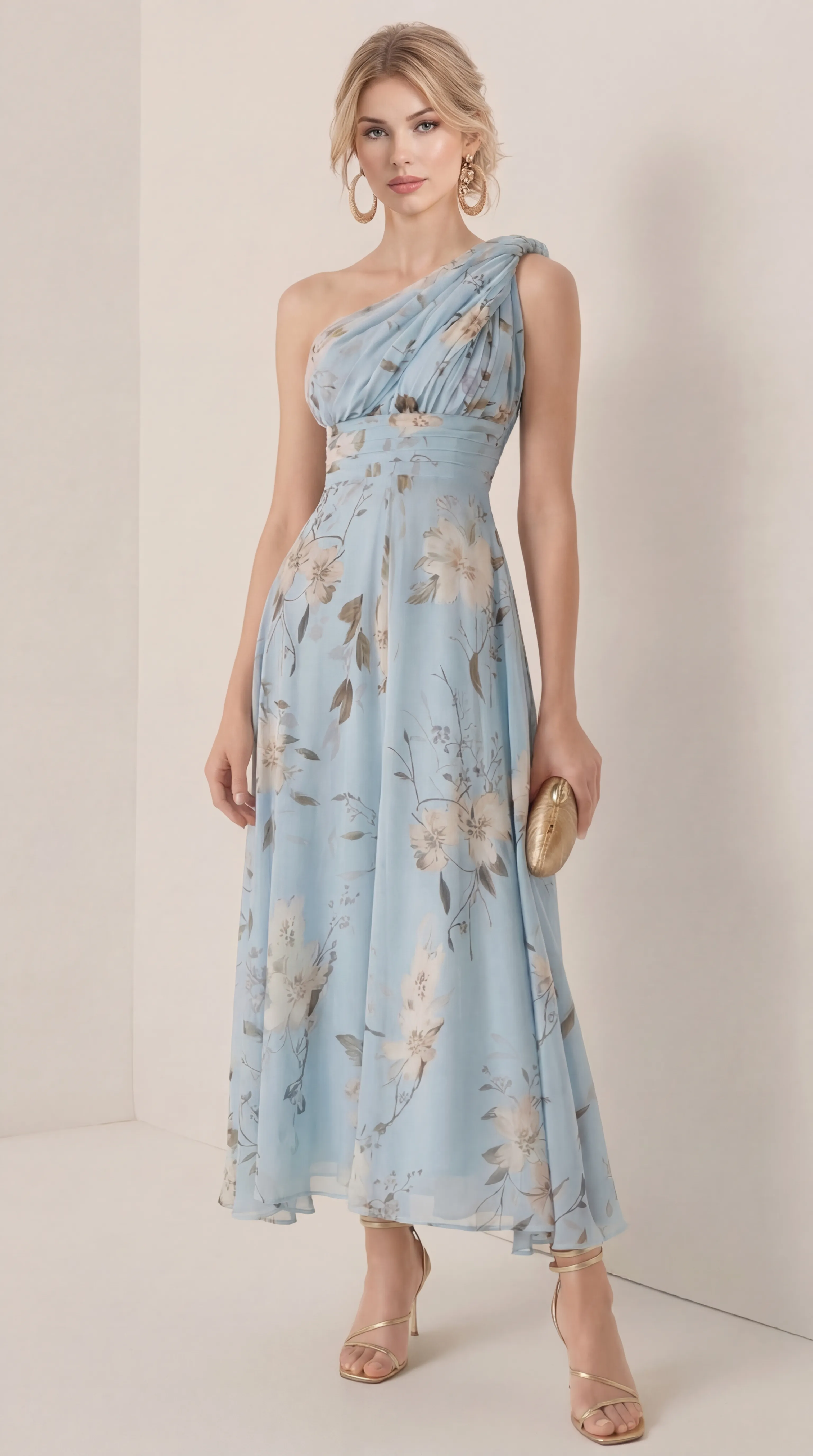 Radiate ethereal beauty in the MUS558, a luxury one-shoulder gown that blends modern structural details with soft, sky-blue botanical art. With its artisanal rolled shoulder, heavy bodice ruching, and a perfectly pleated waist, this silk tơ gown is engineered to provide a sophisticated and breathtaking silhouette for your most memorable celebrations.