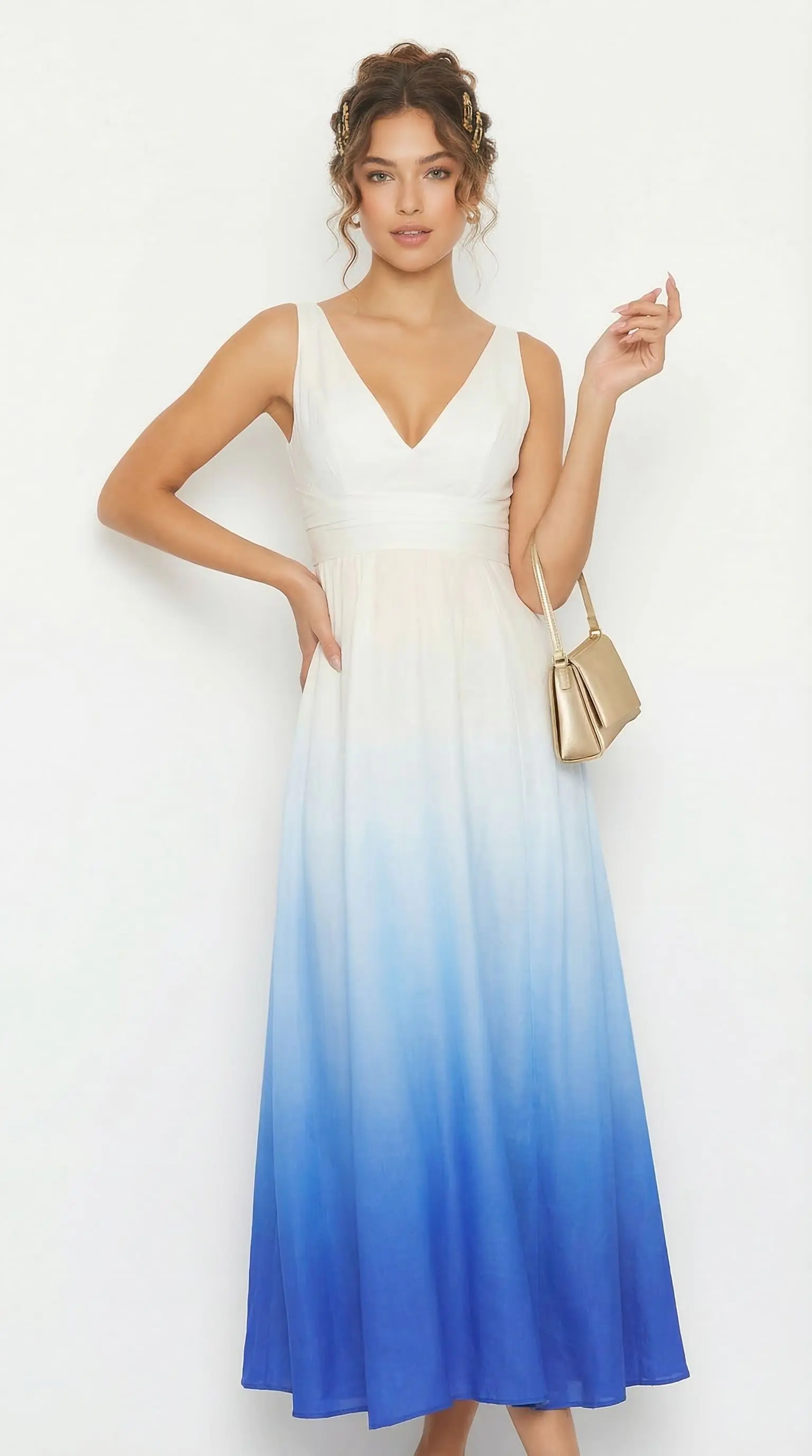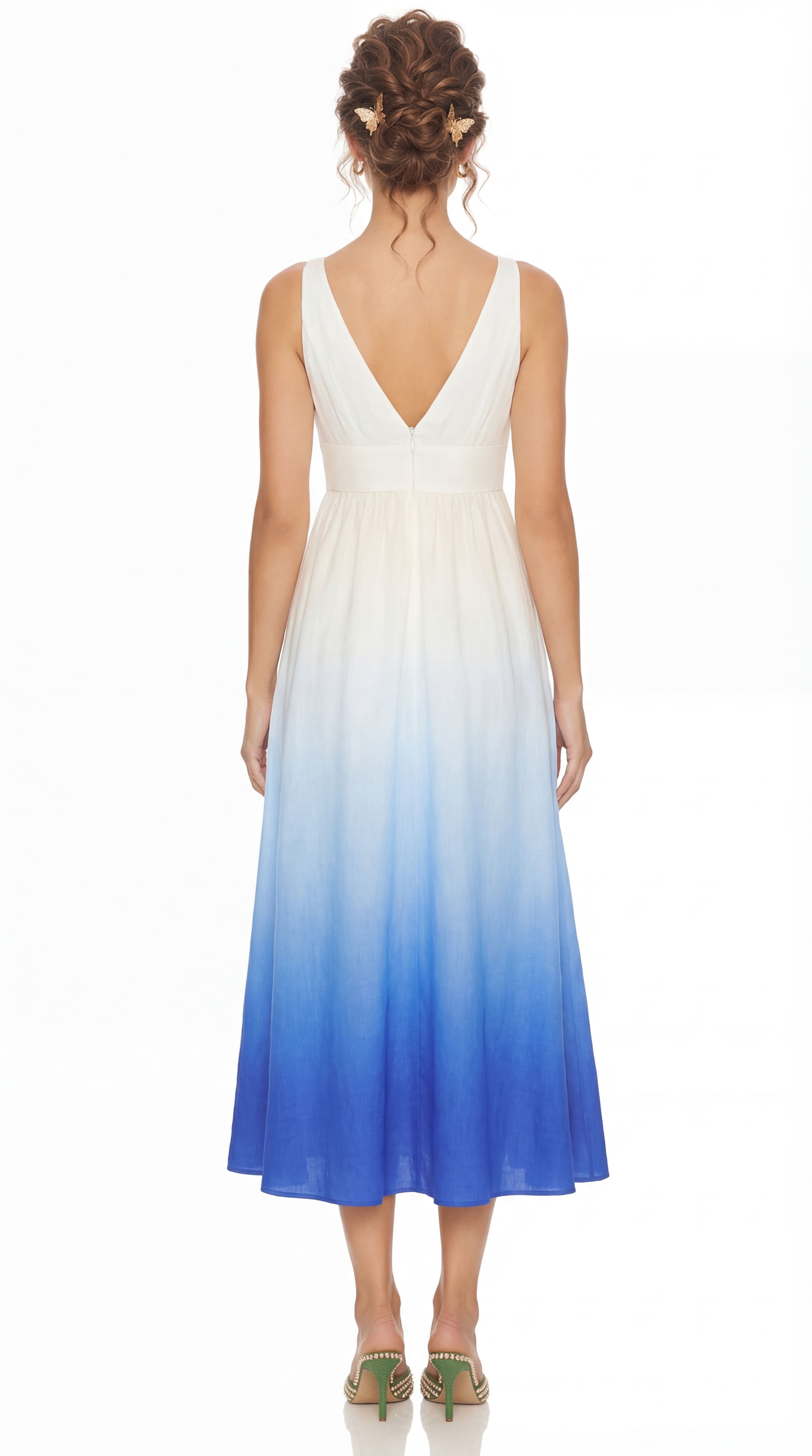 Artisanal Ombré Print: Features a seamless gradient transition, moving from a crisp ivory white at the bodice to a deep, vibrant royal blue at the hem.