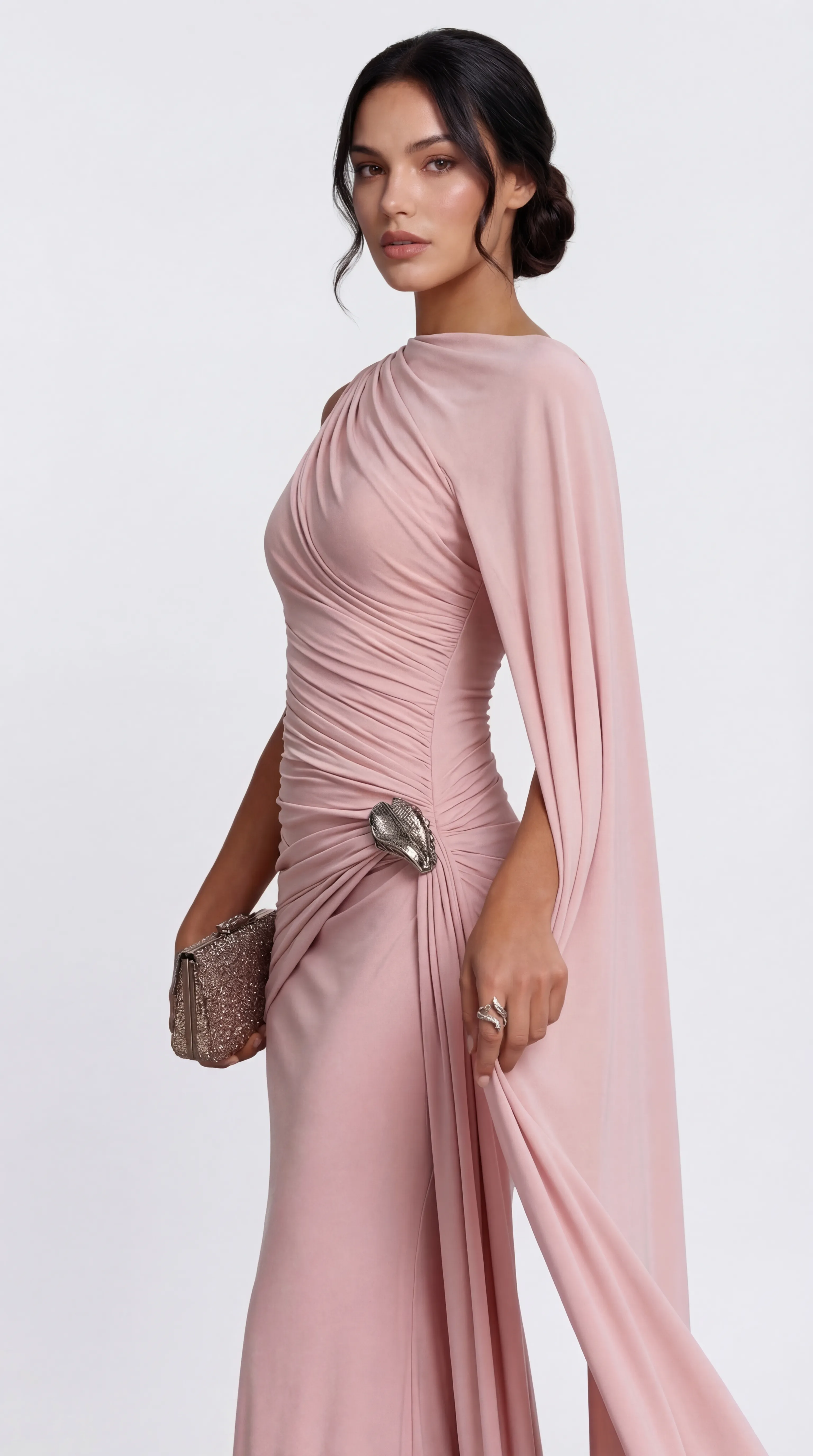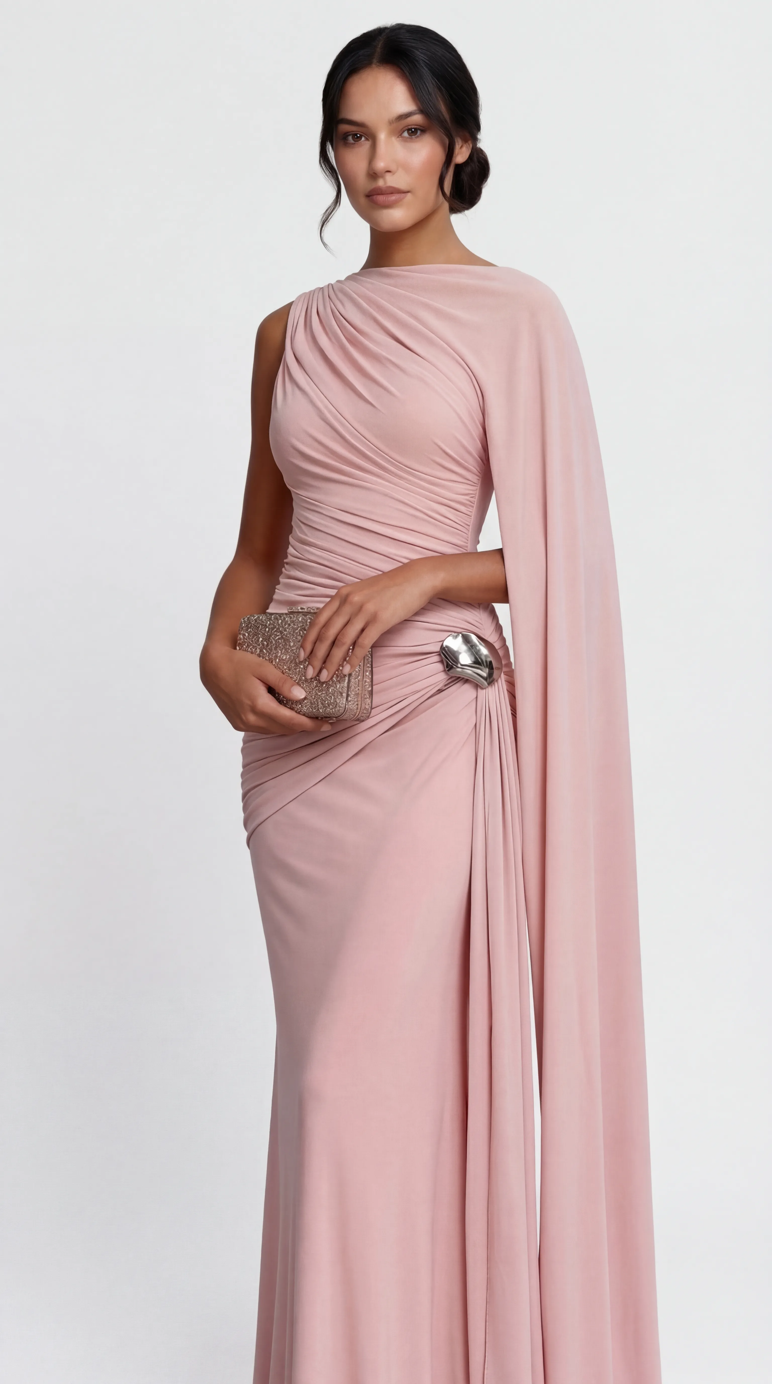 Dramatic Floor-Length Cape Sleeve: The opposite shoulder flows into a continuous, ethereal cape sleeve that extends all the way to the heel, adding regal movement to every step.