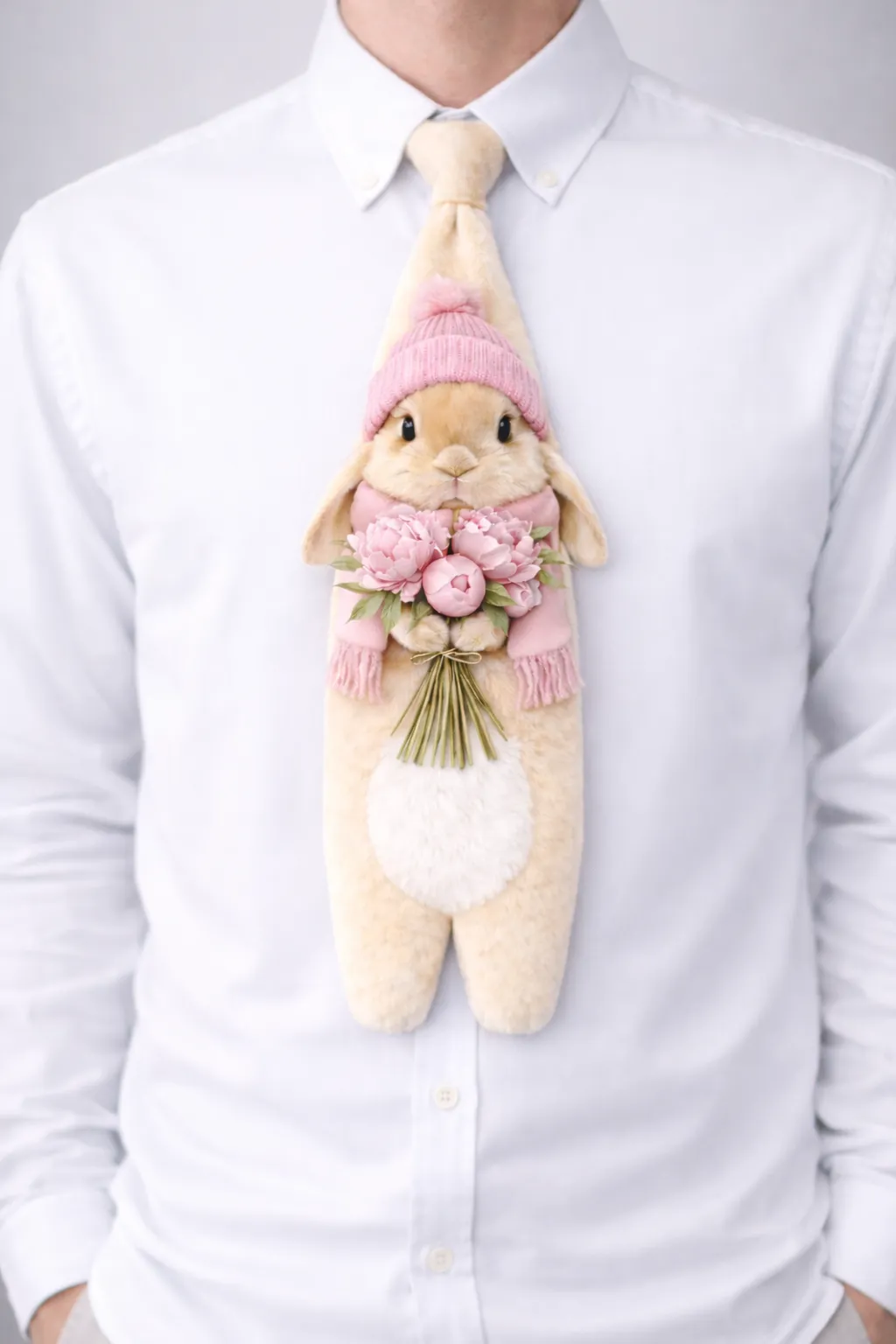 Add a touch of whimsical luxury to his spring wardrobe with the MUS443 tie. Featuring a realistic thermal-printed bunny in a cozy pink scarf and beanie, this heavy silk tie is reinforced with double-sided interlining for a premium, structured look that is perfect for any festive occasion.