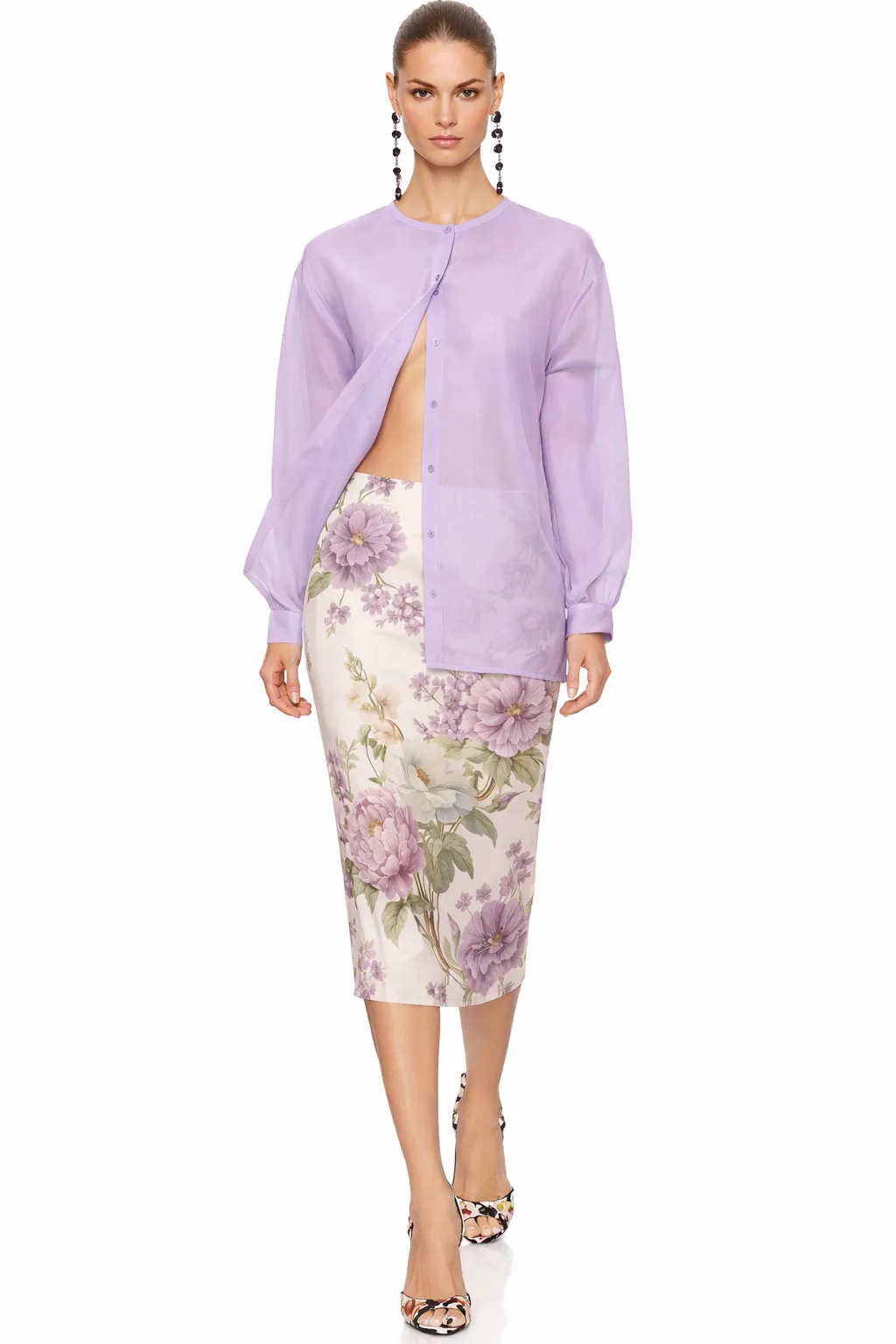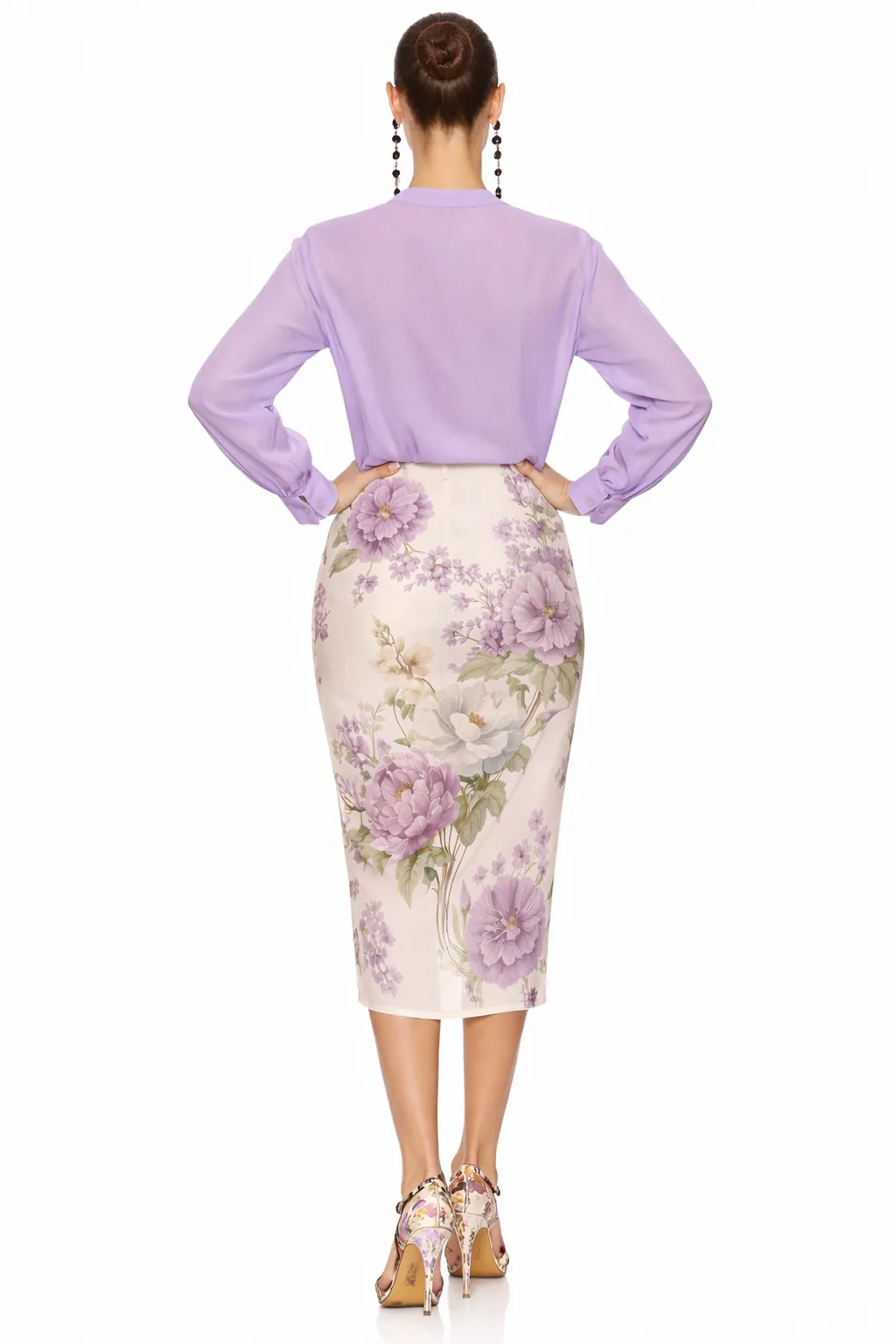 Botanical Print Skirt: The midi-length pencil skirt showcases an artisanal floral print with oversized purple peonies and delicate greenery, creating a striking focal point.
