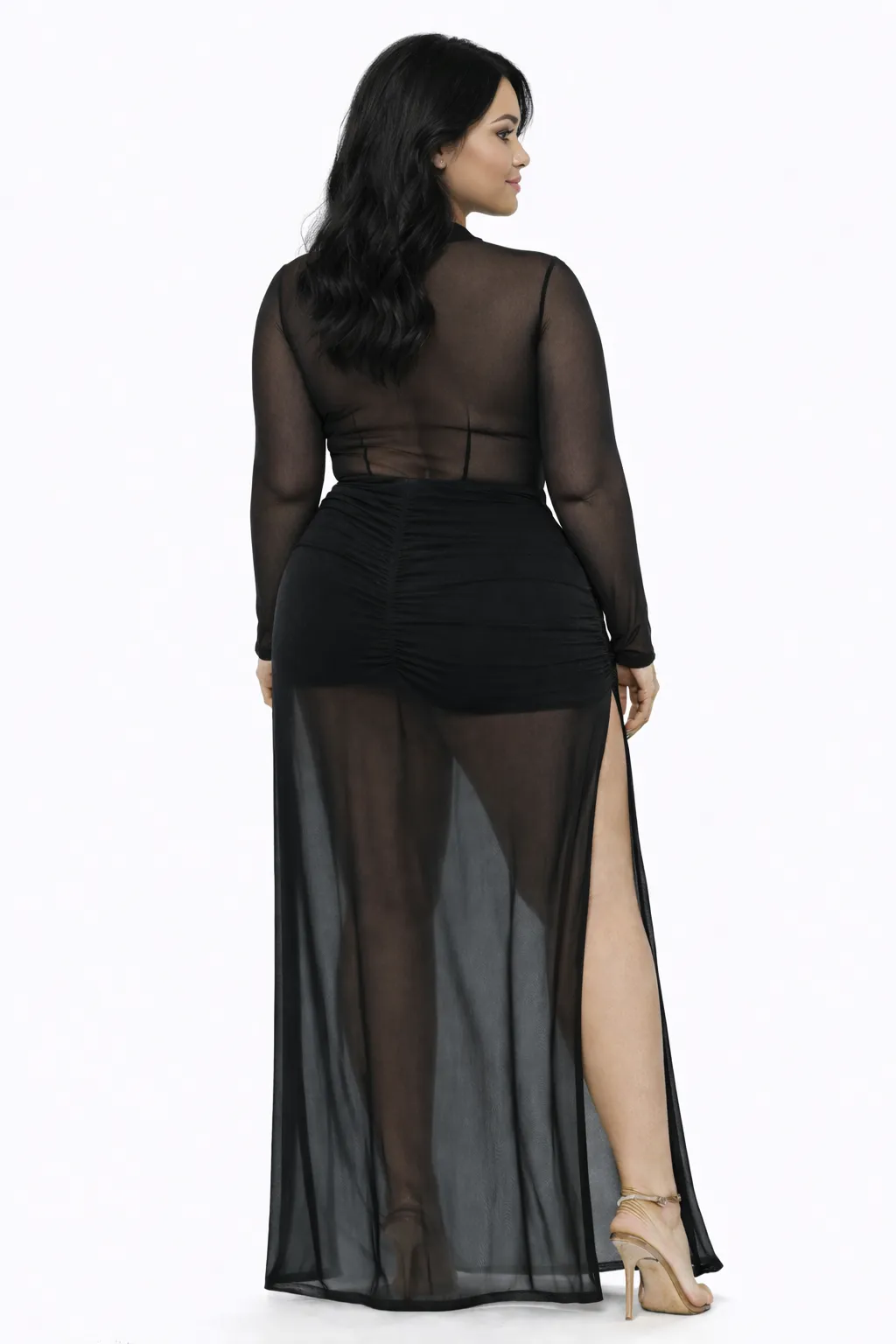 • Silhouette: A floor-length maxi cut that combines the sheer mesh's flow with a structured inner lining for a sophisticated "illusion" effect.