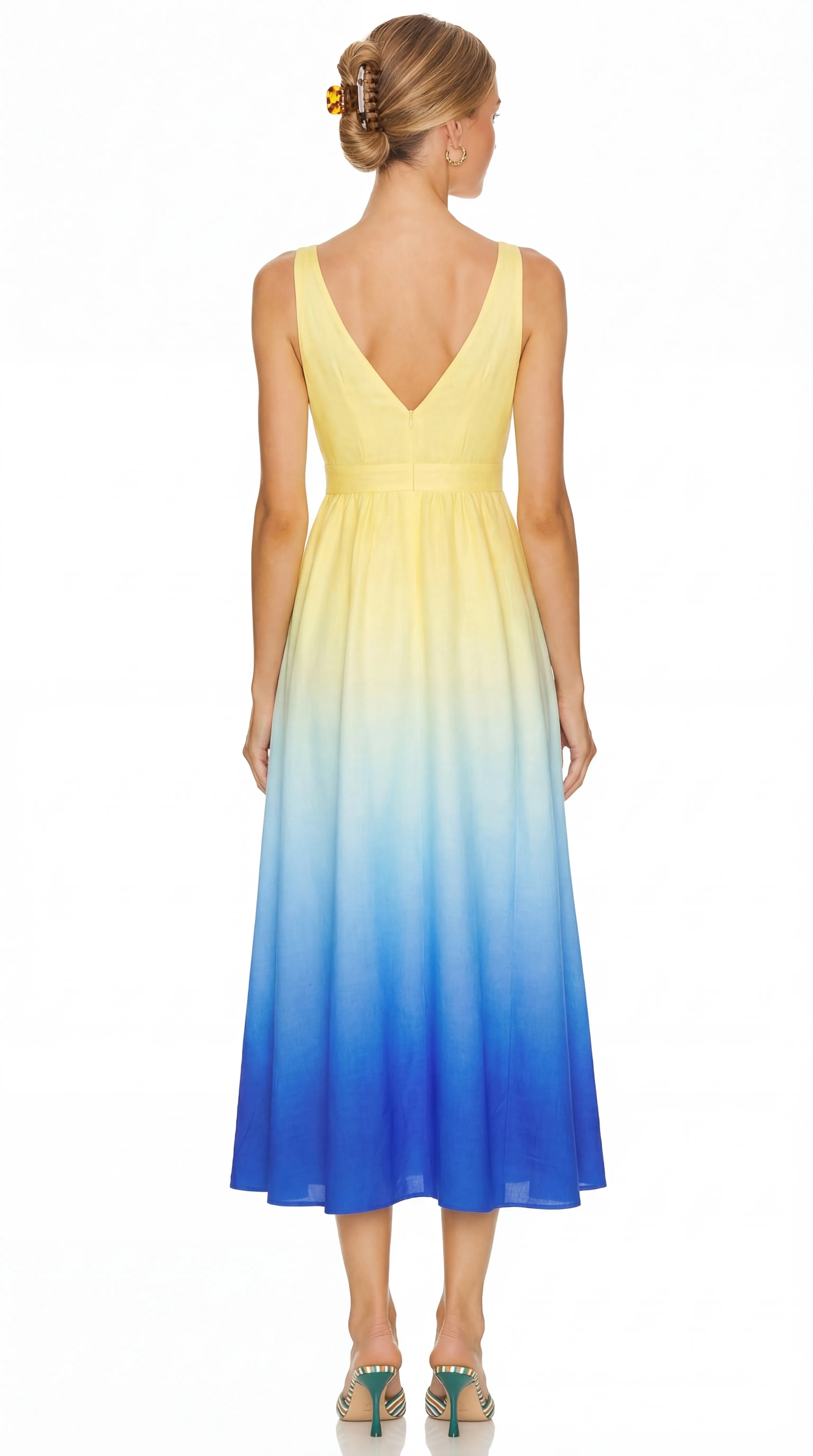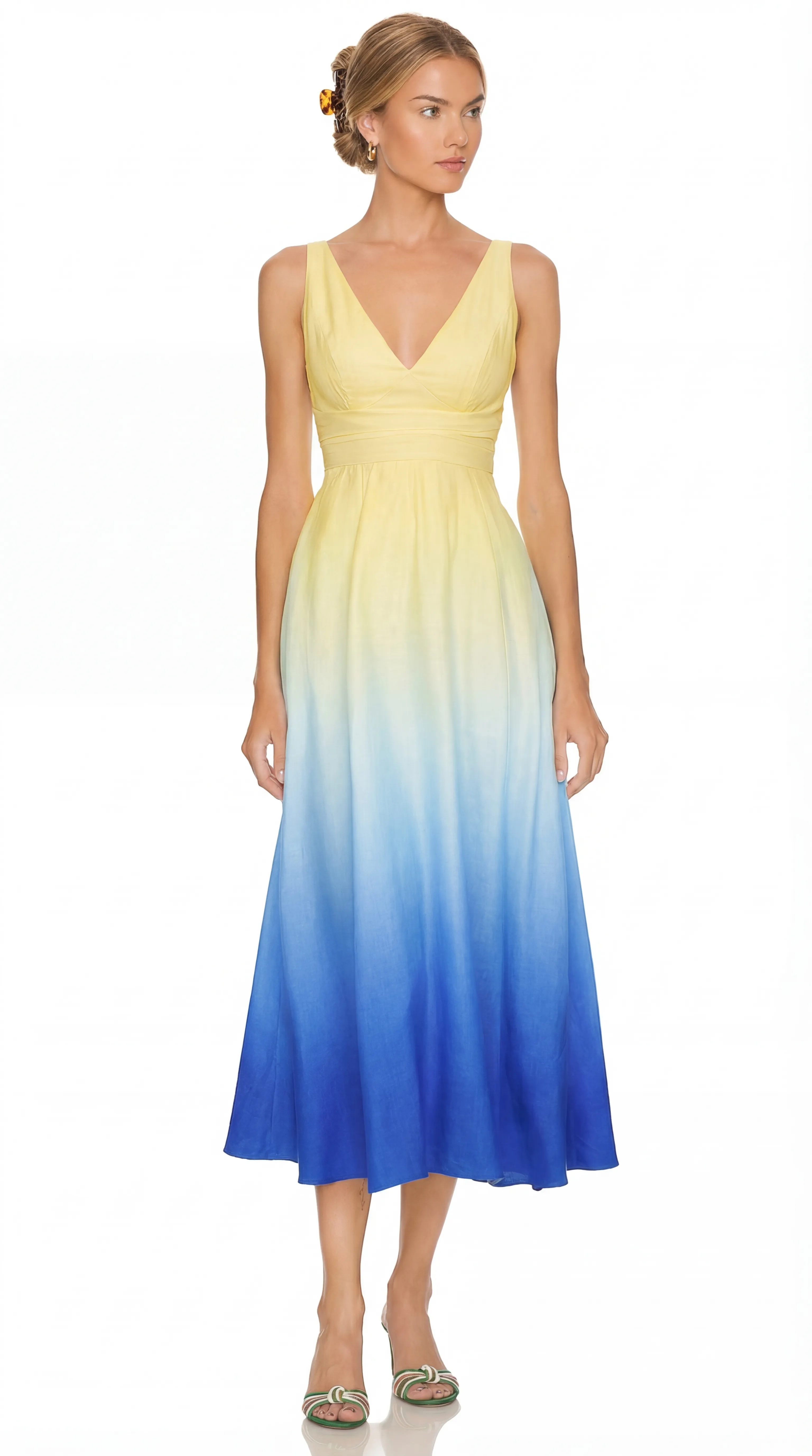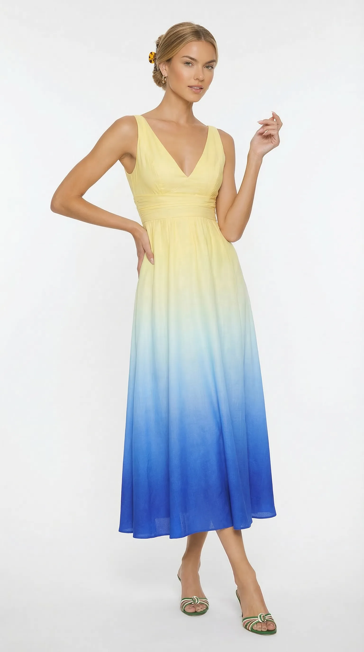 Artisanal Gradient Print: Features a sophisticated ombré transition, starting with a bright sun-yellow at the bodice and flowing into a deep, oceanic royal blue at the hem.