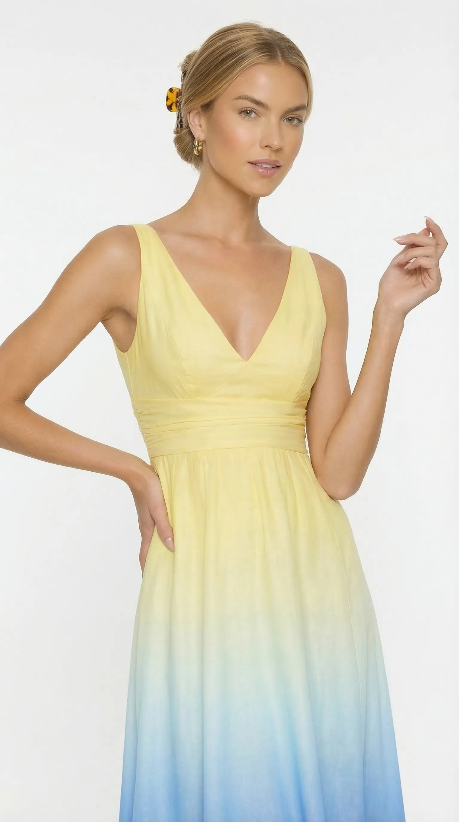 Experience radiant elegance in the MUS509, a luxury silk midi gown that captures the beauty of a summer horizon. Combining a vibrant yellow-to-blue ombré effect with a masterfully tailored bodice, this dress is the ultimate statement piece for sophisticated seasonal celebrations.