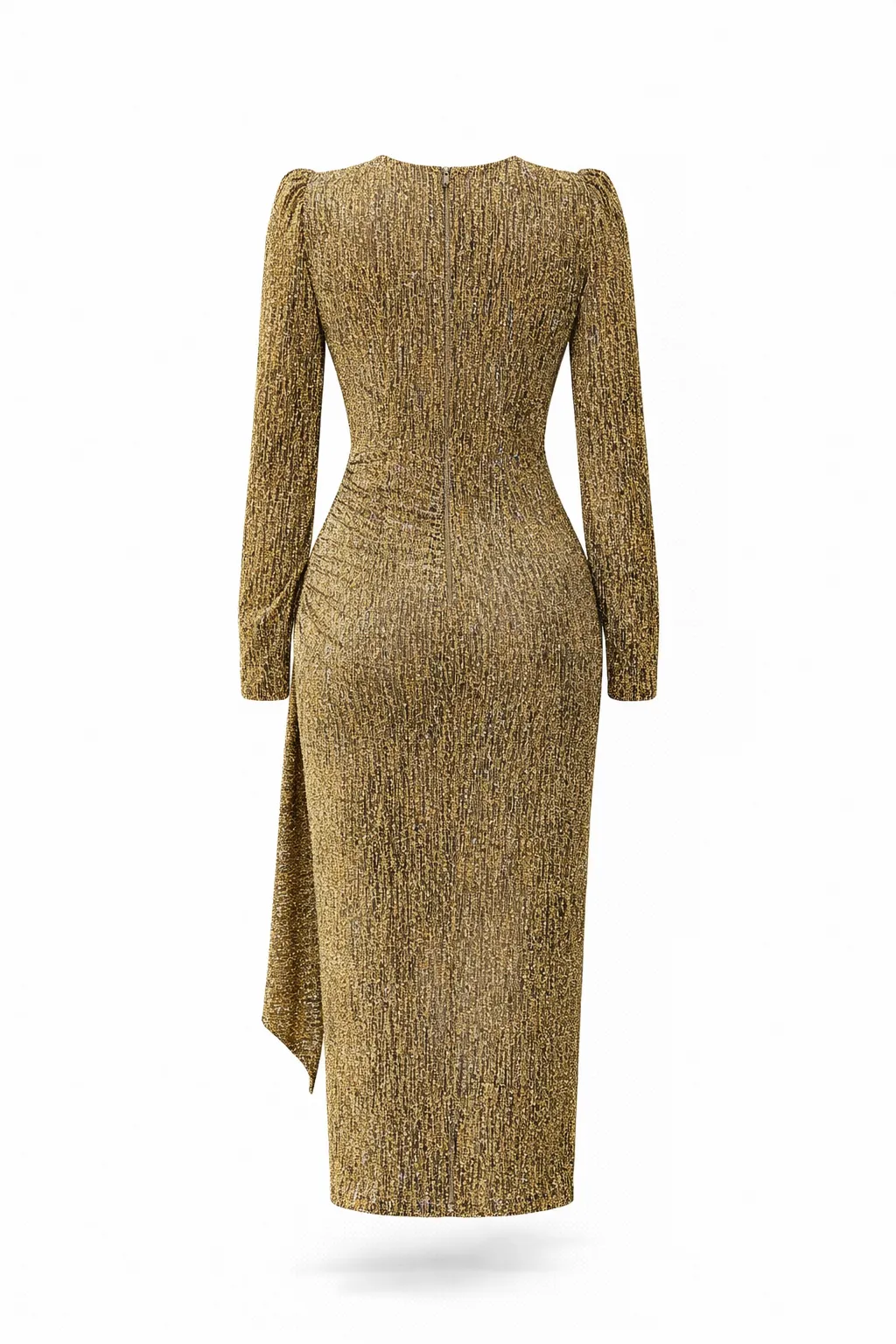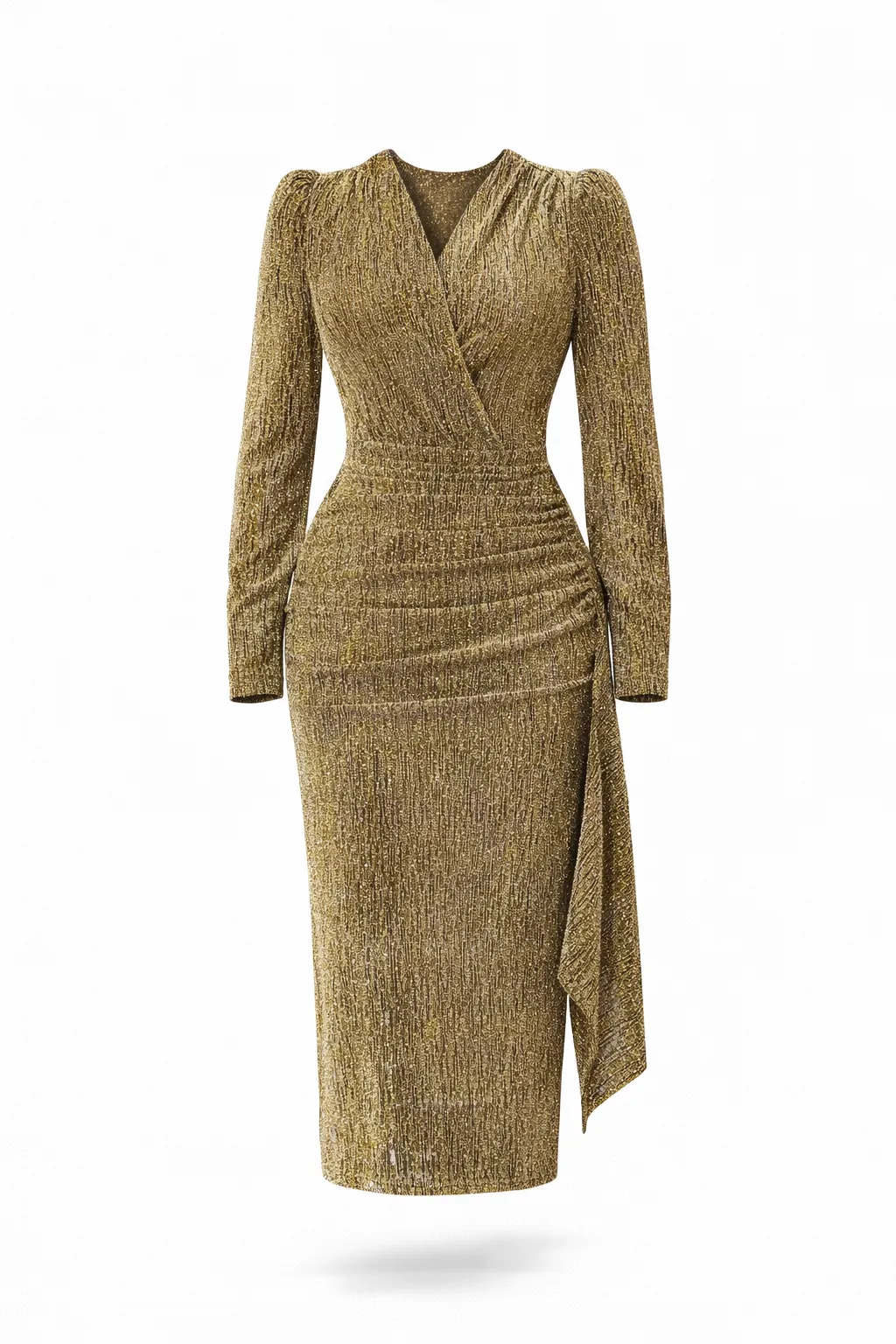 A shimmering bodycon midi dress in premium metallic knit fabric, featuring a flattering V-neckline, waist drape detail, and a subtle back slit. Elegant, comfortable, and effortlessly glamorous.