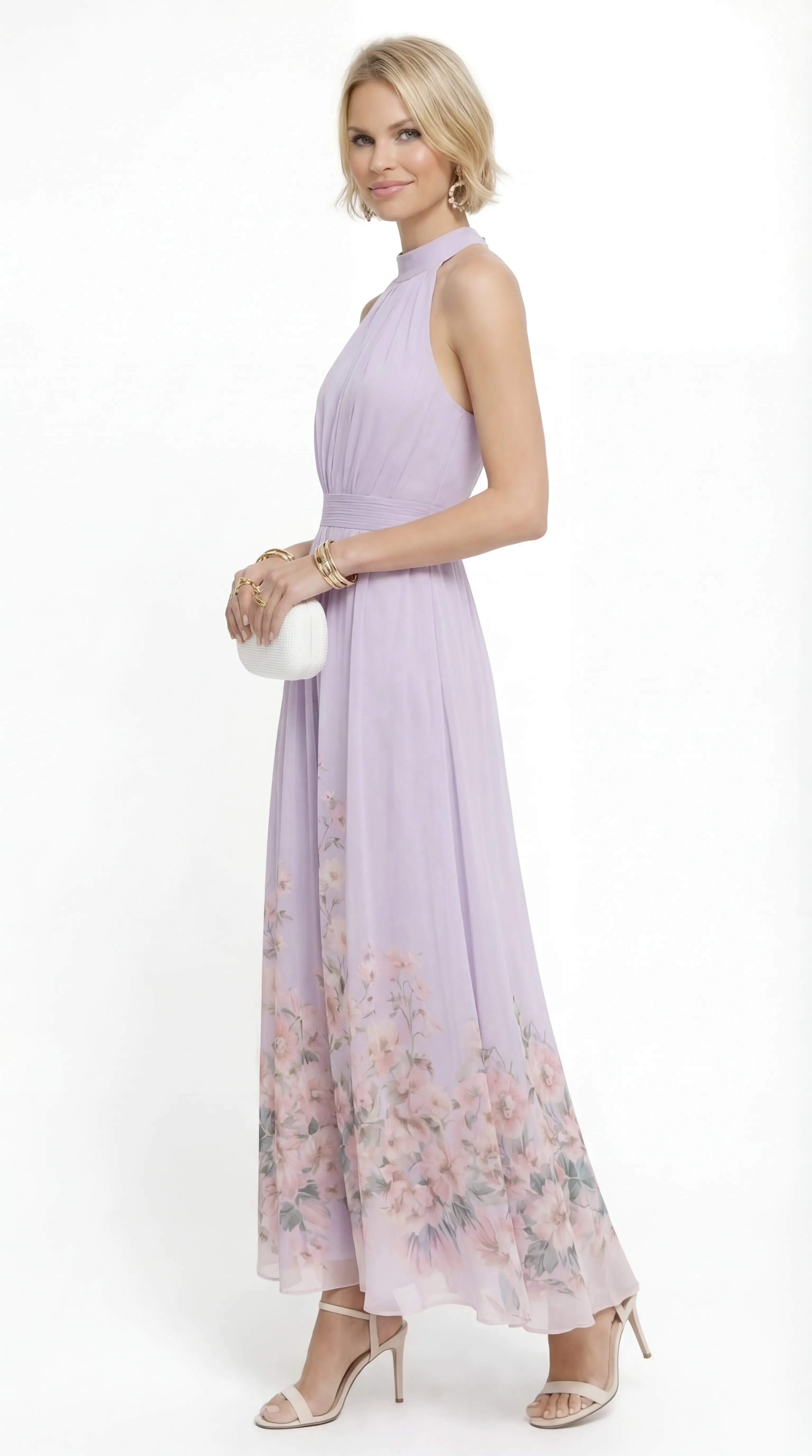 Experience a moment of pure serenity in the MUS578, a luxury silk tơ gown in a captivating lavender mist. With its sophisticated pleated halter neckline, vibrant floral border print, and airy floor-length skirt, this dress offers a breathtaking blend of modern elegance and timeless romanticism.