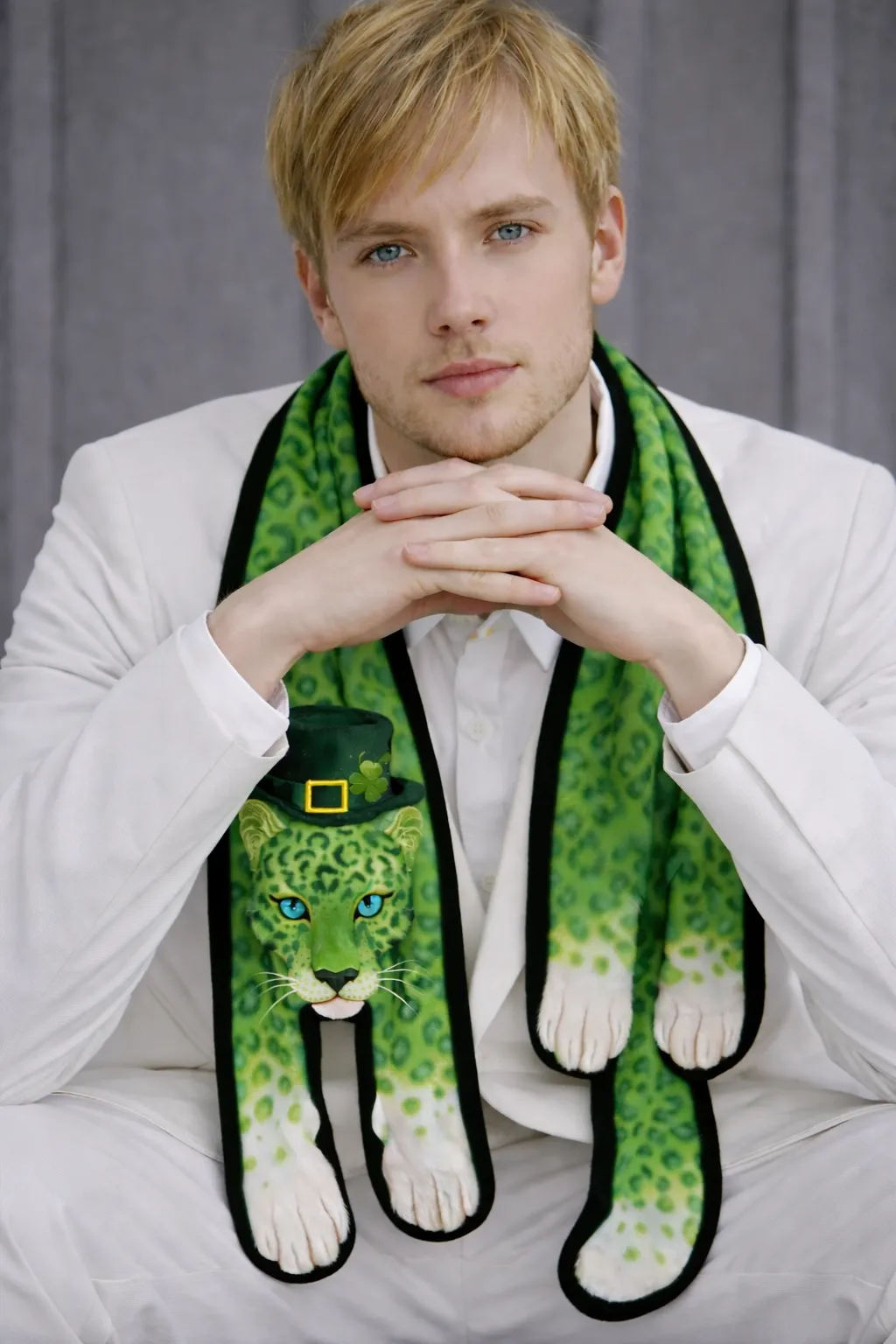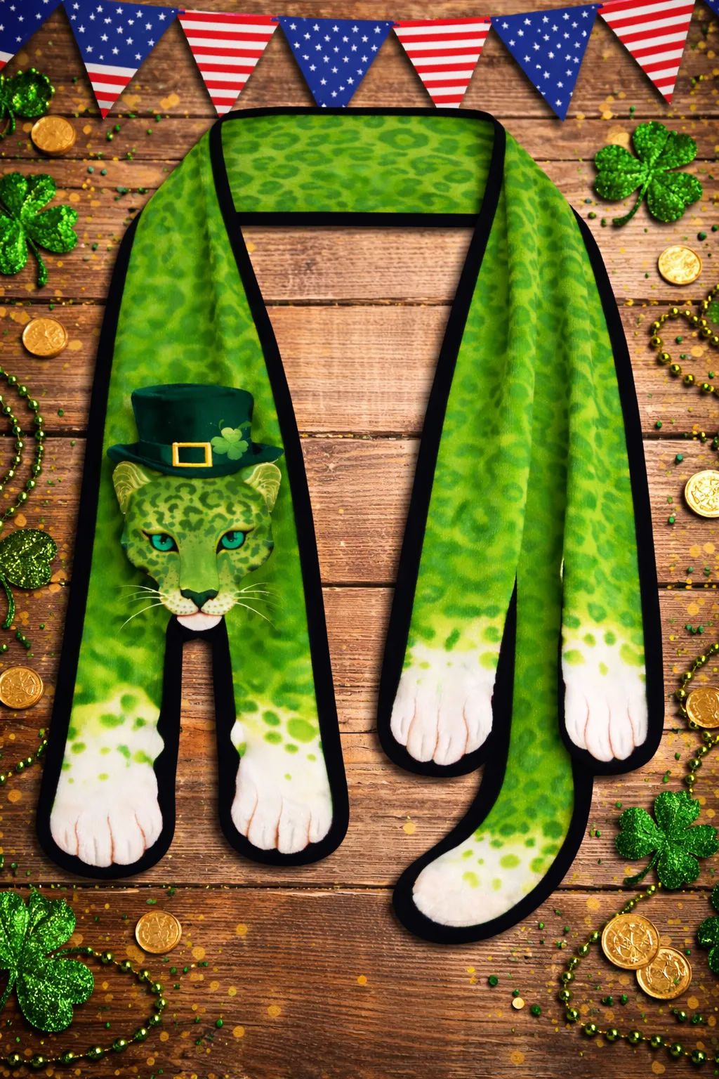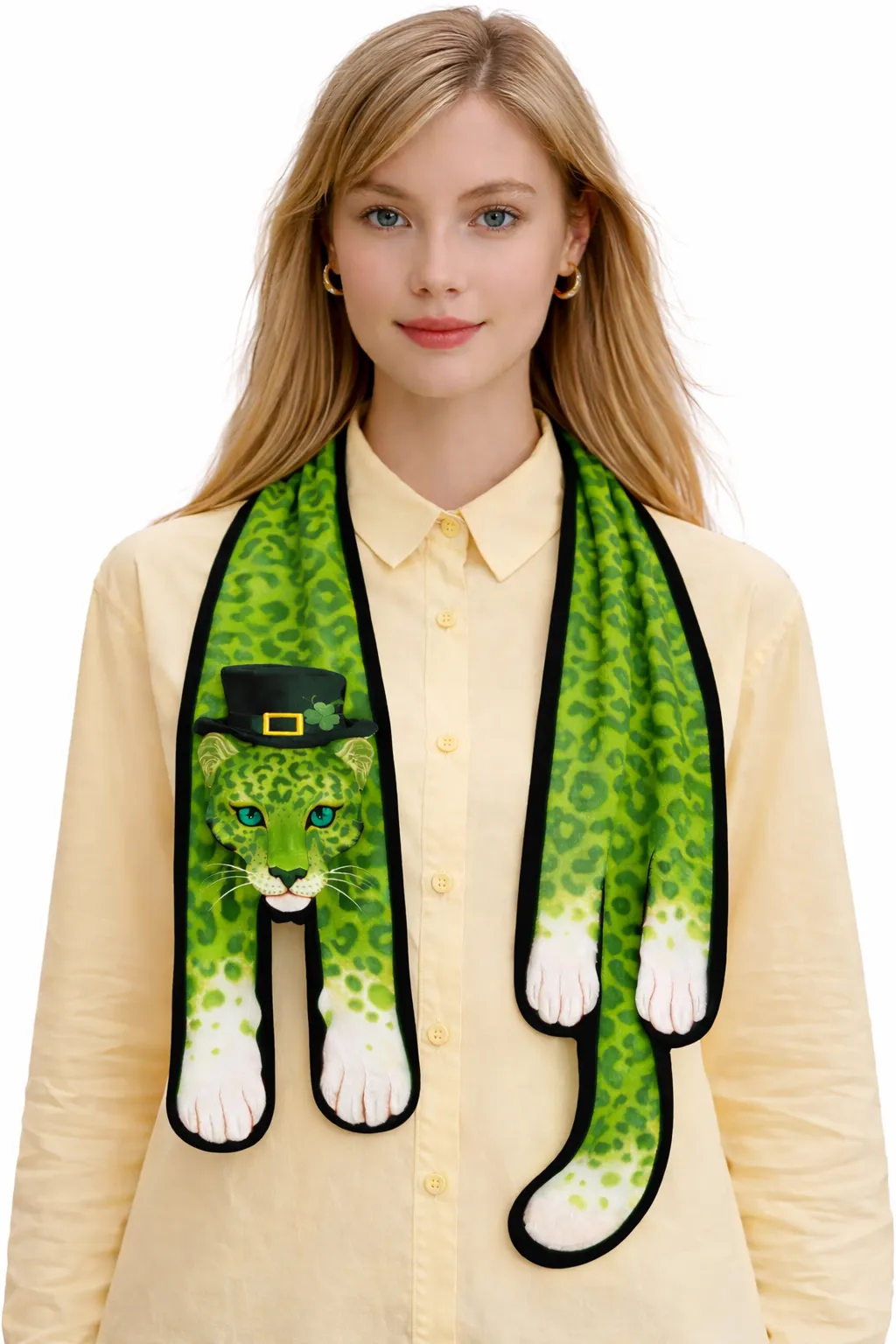 Front View: The scarf features a striking 3D-effect leopard head at the terminal end, complete with bright blue eyes and a miniature St. Patrick's Day top hat for a playful yet sophisticated touch.