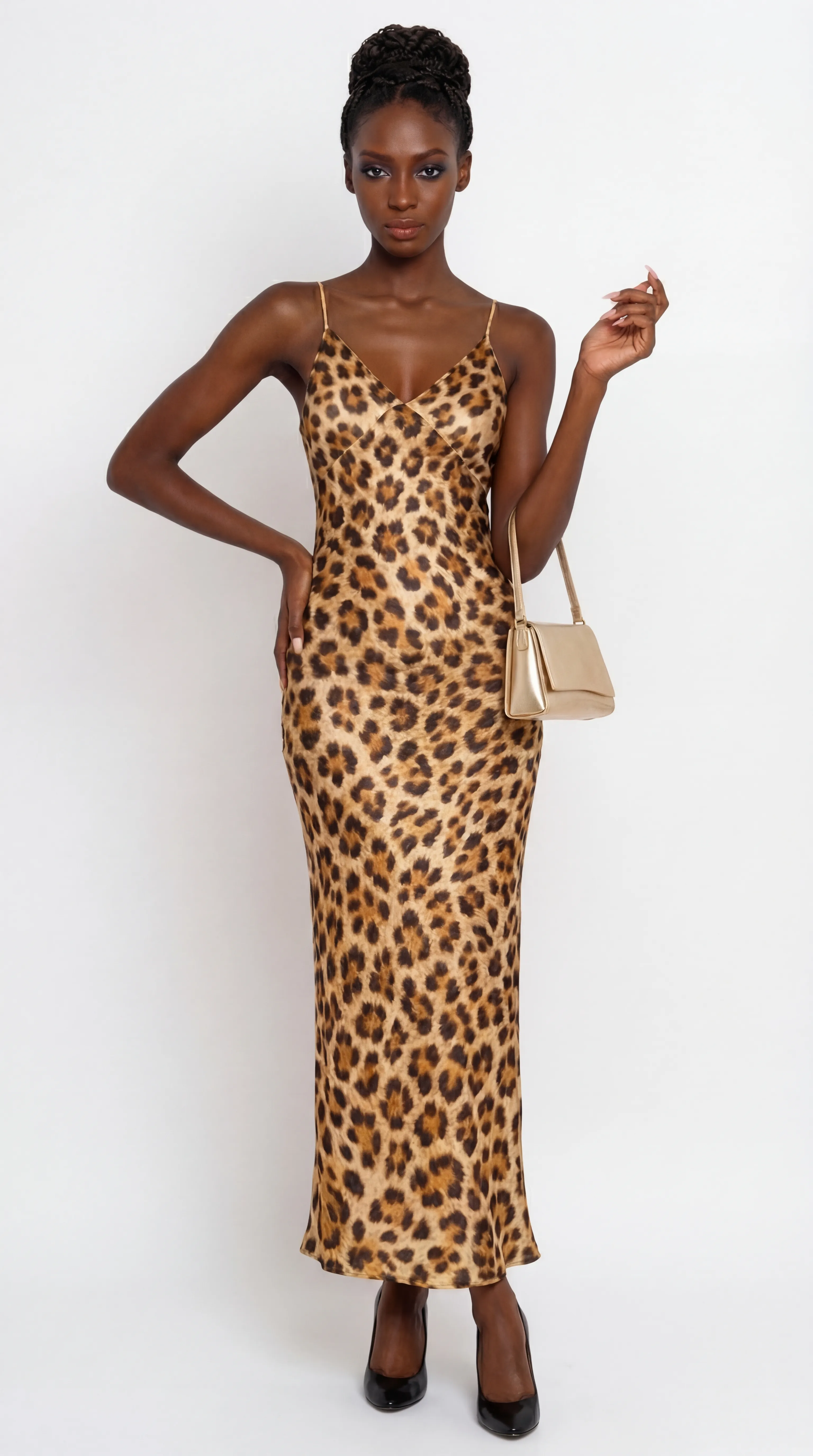 Unleash your inner confidence with the MUS549. Crafted from radiant premium silk in a striking leopard print, this slip dress pairs a delicate two-strap front with a dramatic draped cowl-back, offering the ultimate blend of bold personality and timeless luxury.