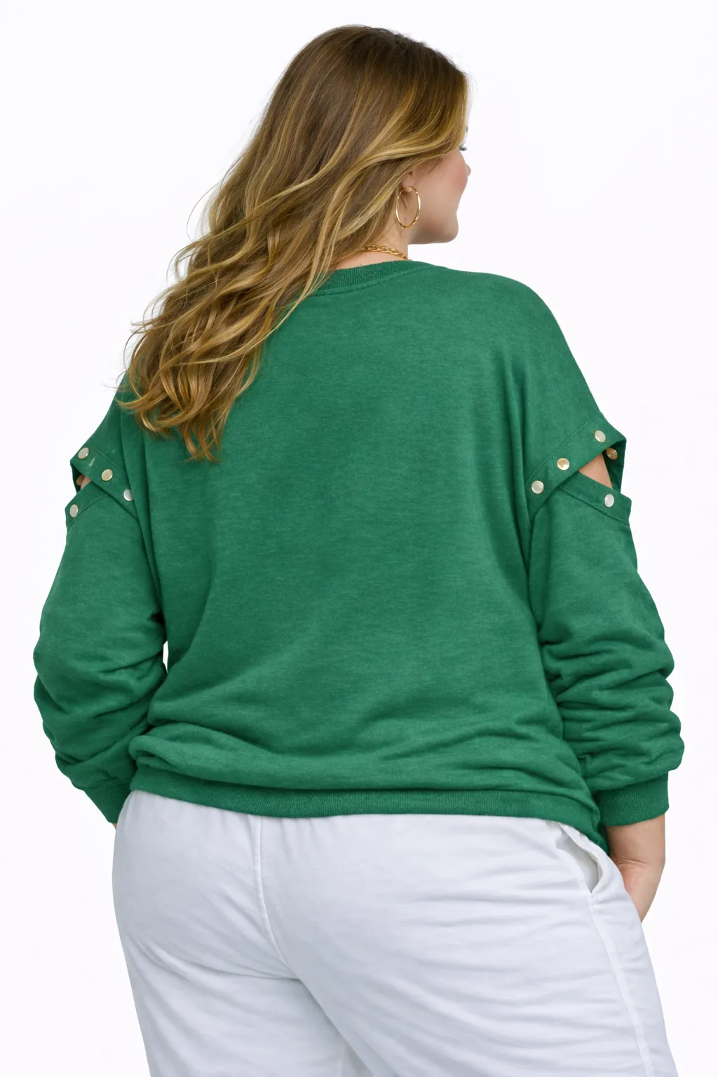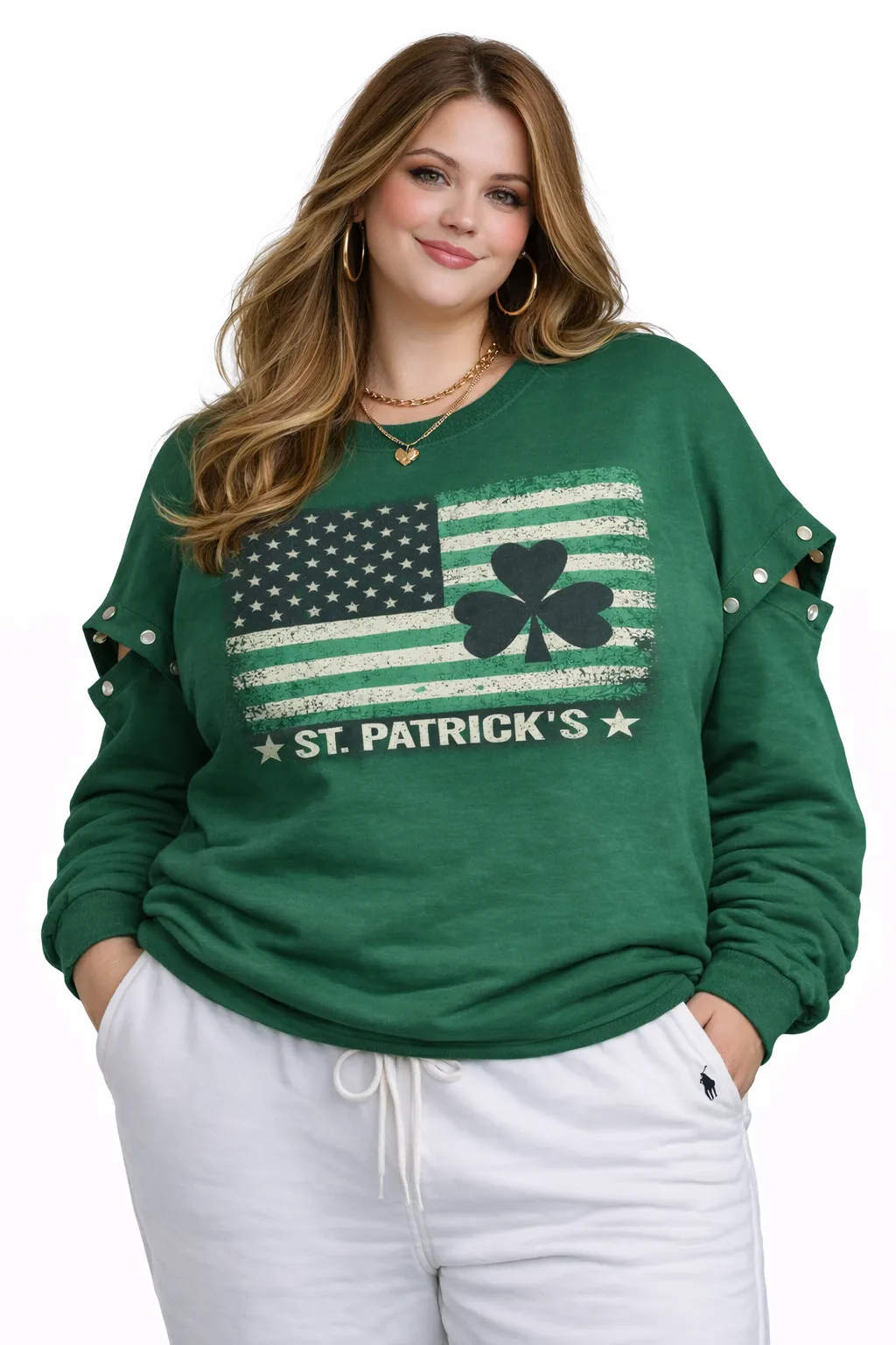 This piece stands out by blending patriotic aesthetics with festive Irish motifs and a unique, deconstructed sleeve design: