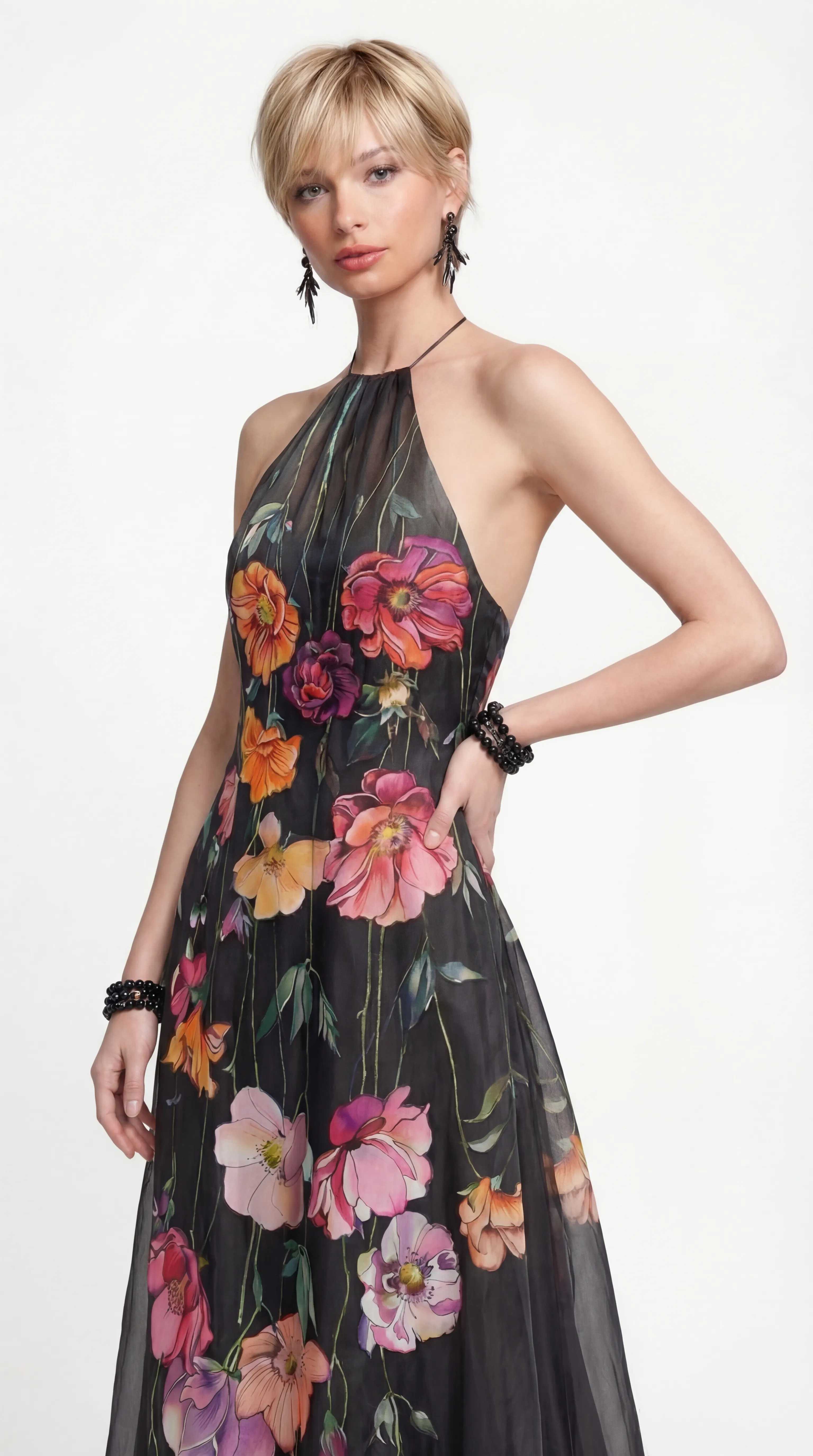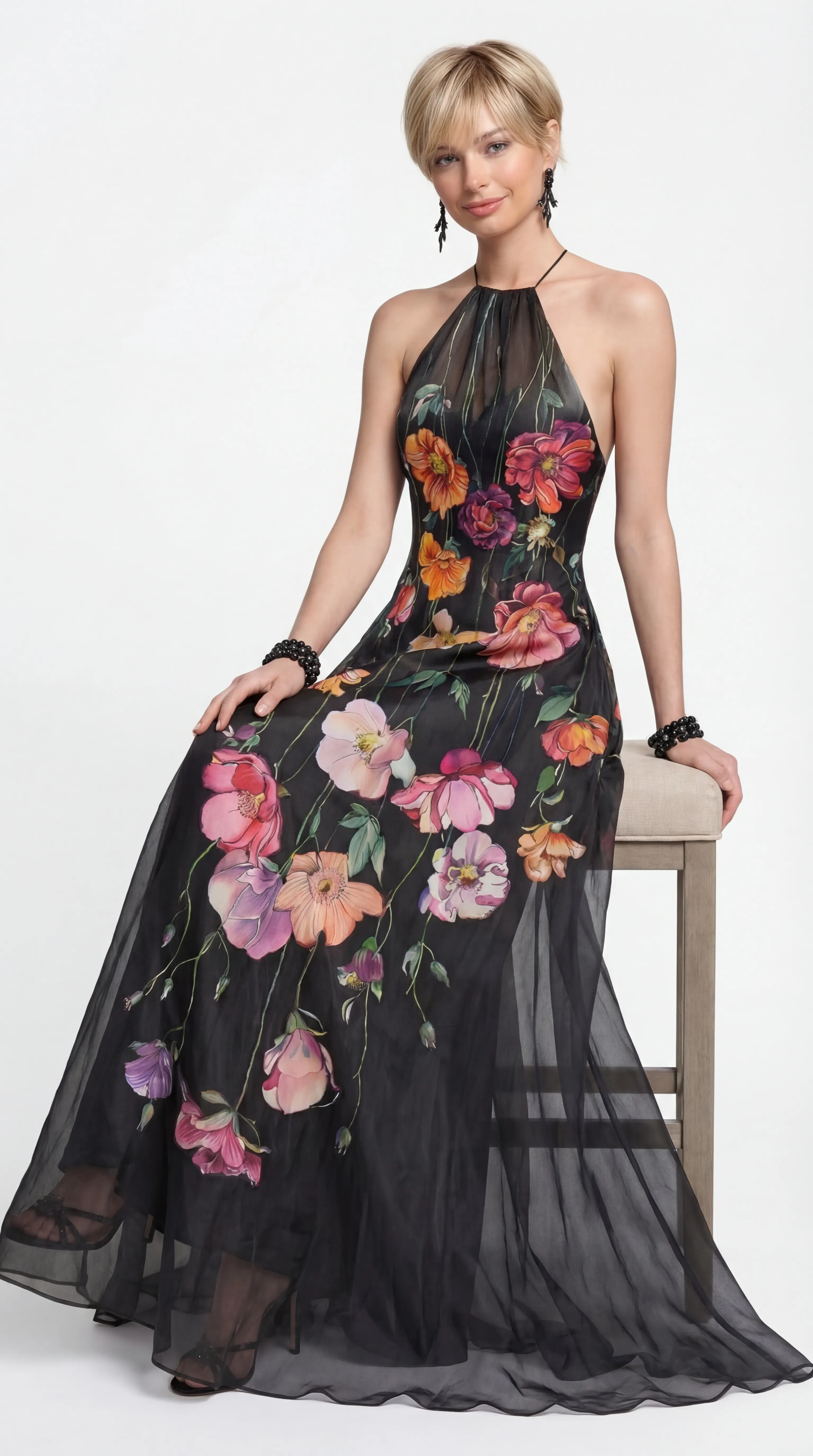 MIDNIGHT BLOSSOM HALTER GOWN – PREMIUM SILK TƠ | MUS540
