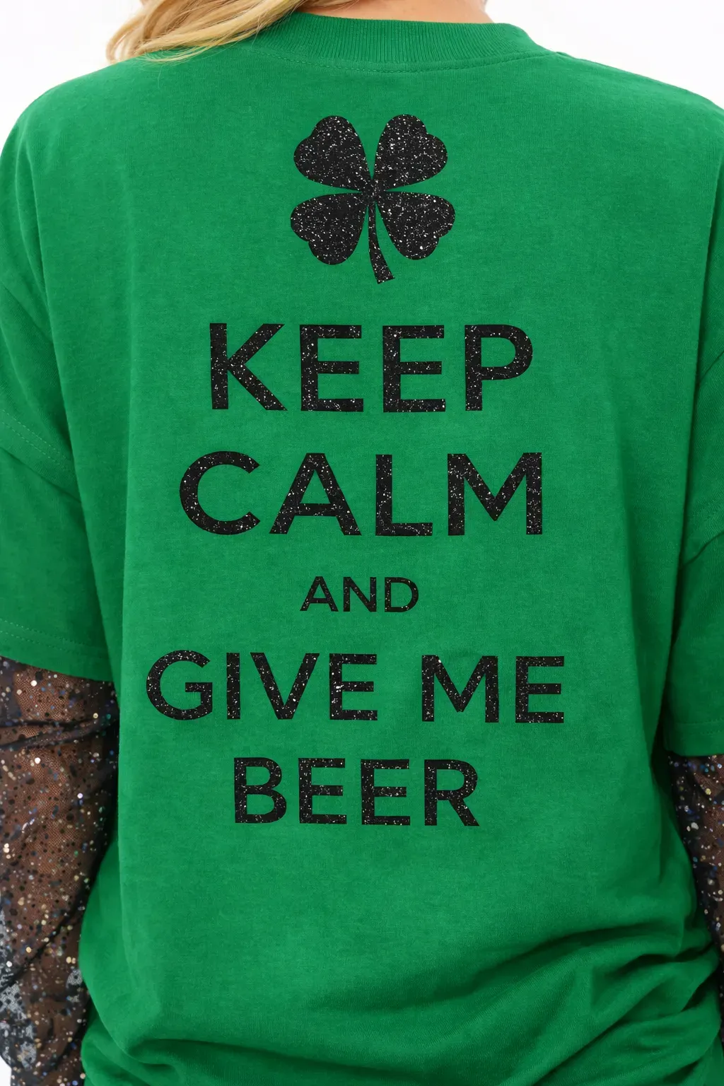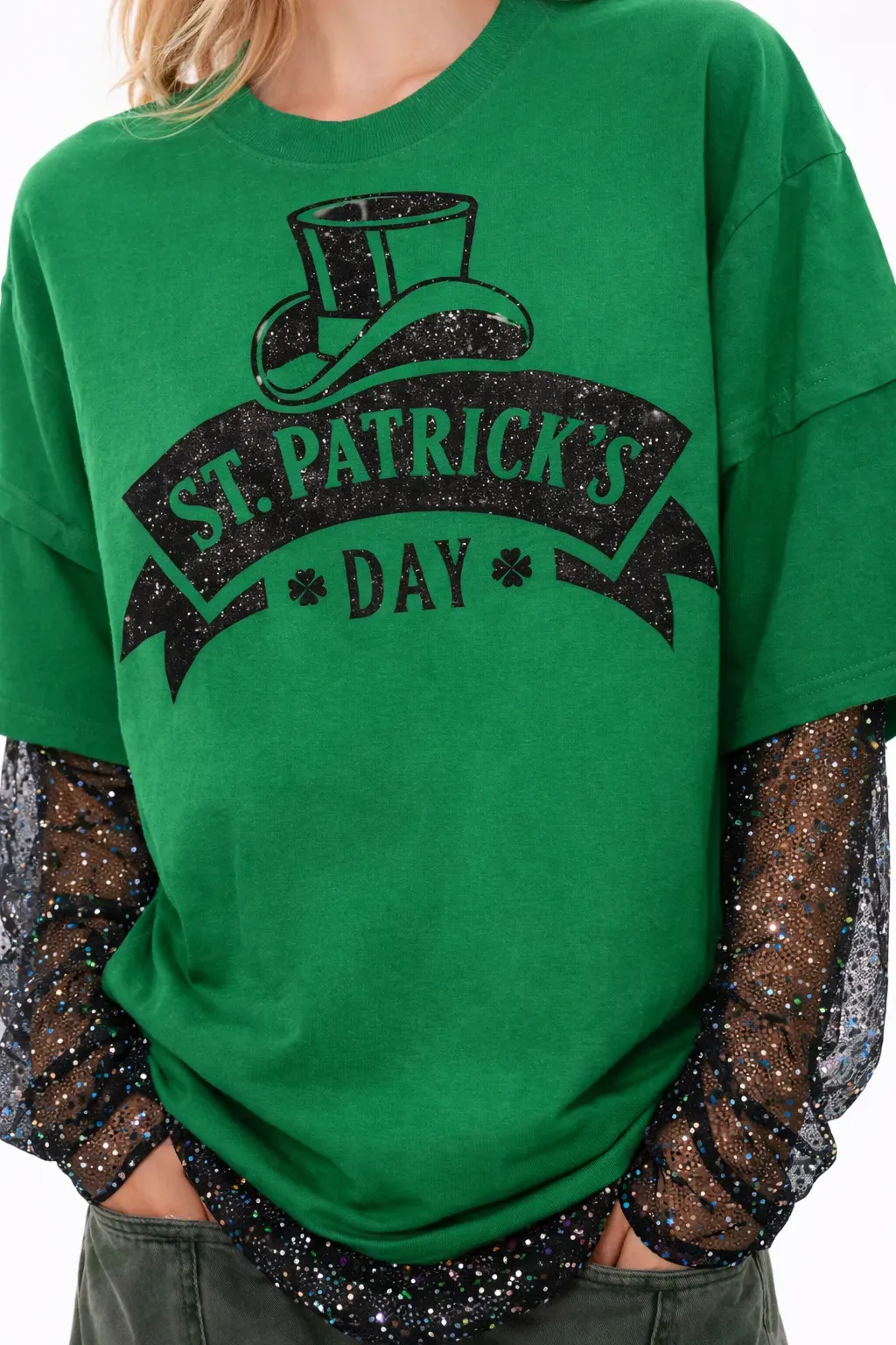 Graphic Detail: The front showcases a premium Black Glitter Decal print (in đề can nhũ đen). The graphic features a stylized "St. Patrick's Day" banner topped with a shimmering lucky hat, providing a subtle yet eye-catching contrast against the vibrant green base.