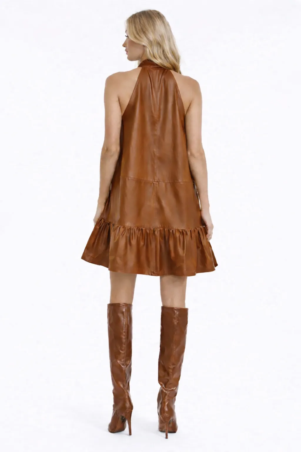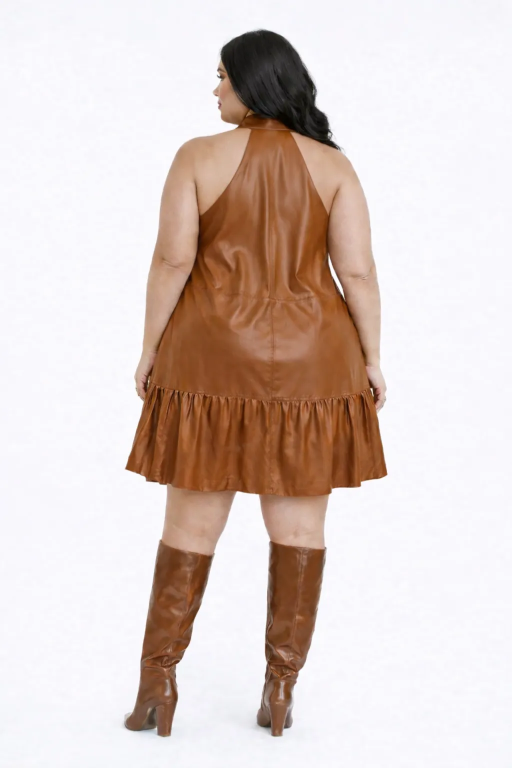 MODERN FAUX LEATHER HALTER MINI – EDGY ELEGANCE | MDU352US
