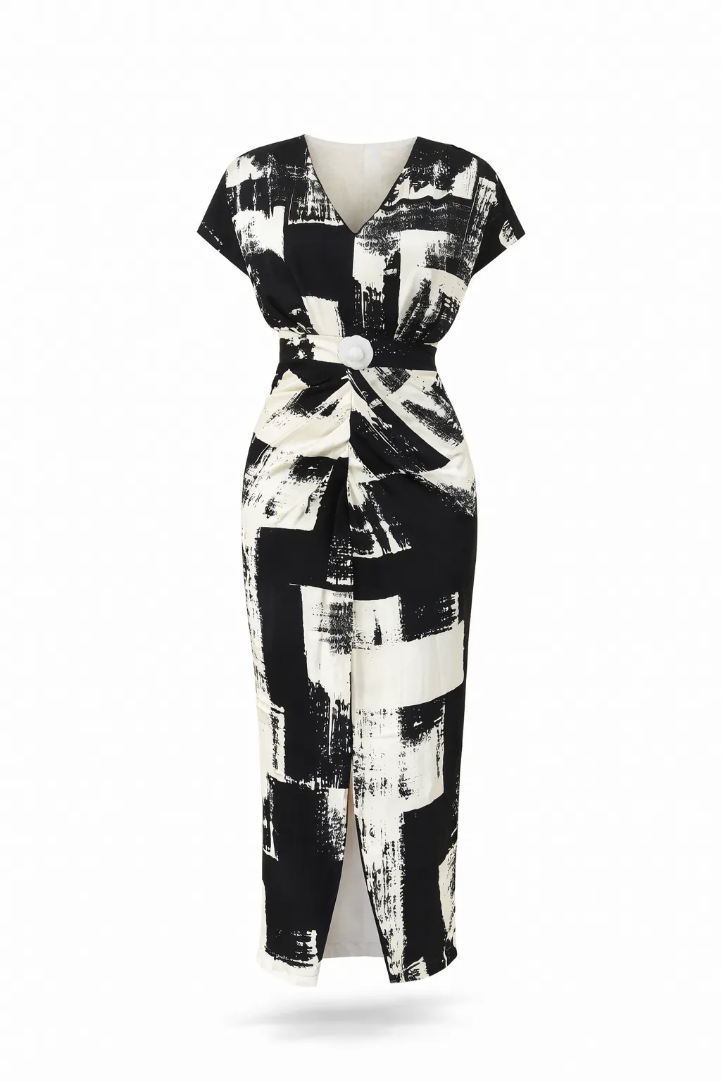 A black-and-white abstract midi dress made from premium Mango silk, featuring a flattering waist detail, elegant front slit, and soft double-layer construction for comfort and sophistication.