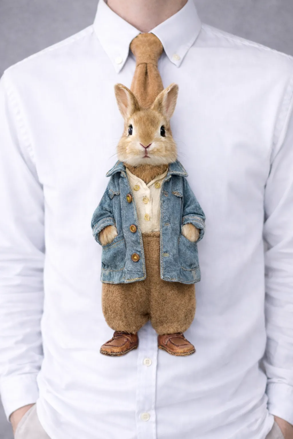 "Country Gentleman" Bunny Motif: Showcases an adorable, realistic bunny character dressed in a classic denim jacket, a buttoned waistcoat, and textured brown trousers with tiny matching shoes.