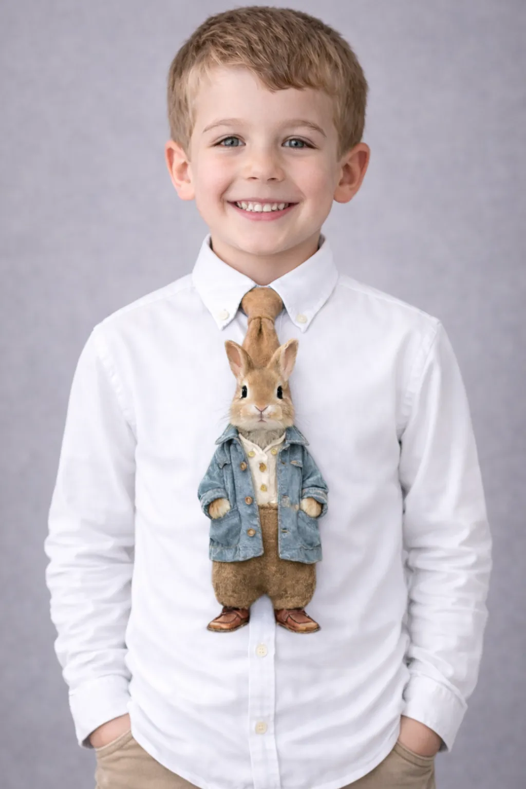 The MUS485 is a masterpiece of seasonal style, featuring a lifelike plush bunny in a denim jacket on a heavy silk tie. With its double-sided reinforced construction and intricate thermal-printed details, this accessory offers a unique blend of high-end quality and storybook charm for any special spring occasion.