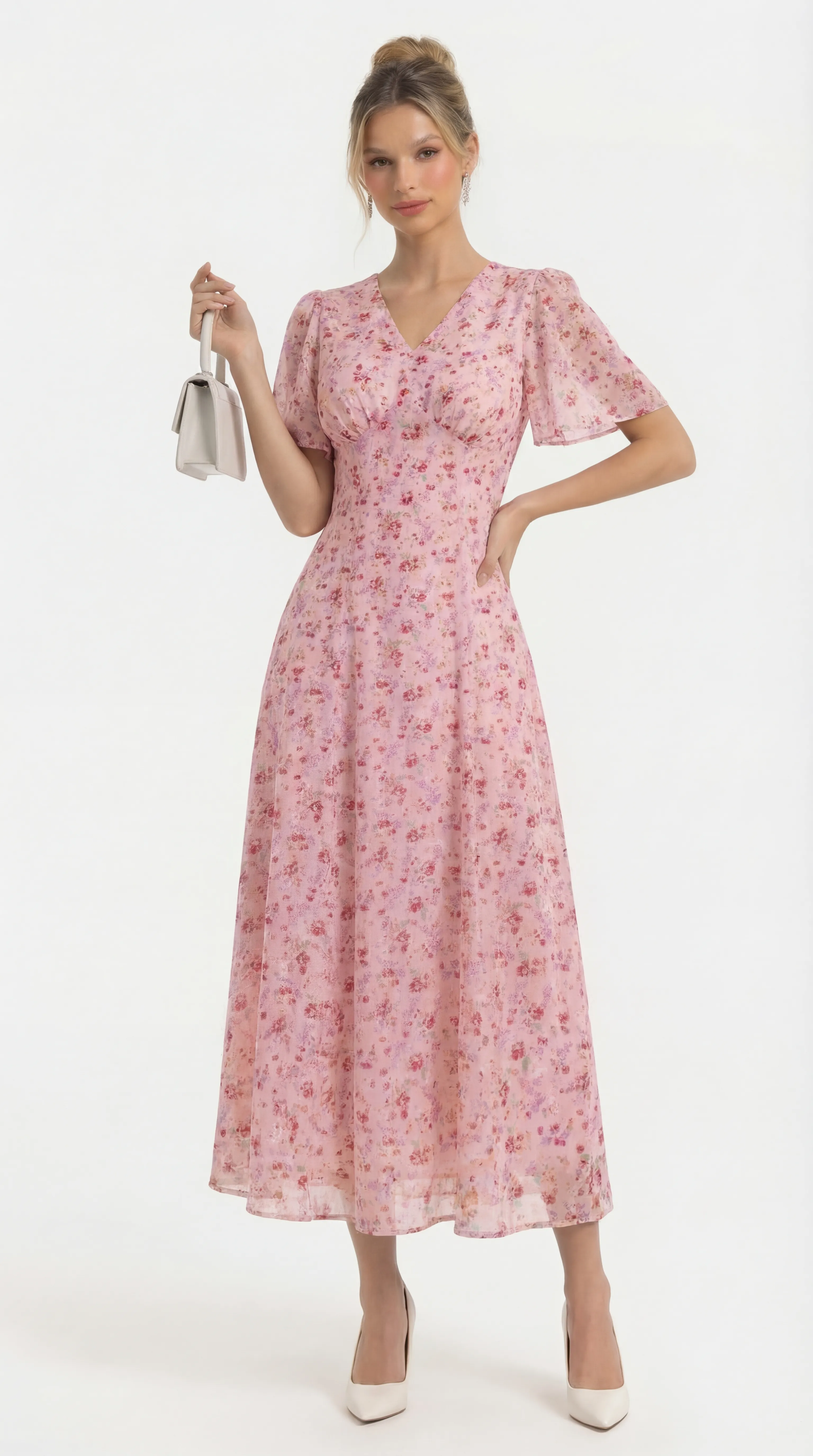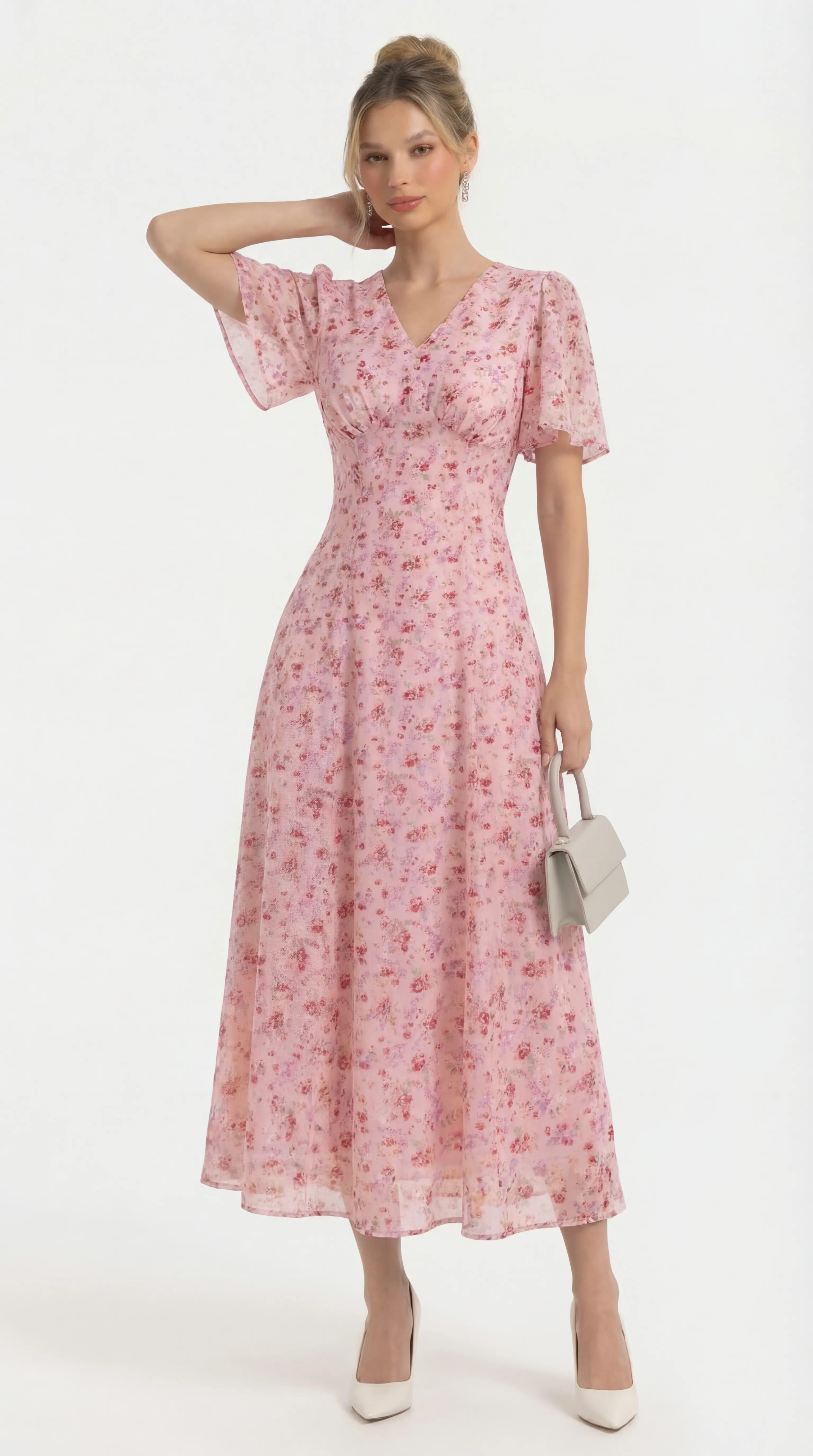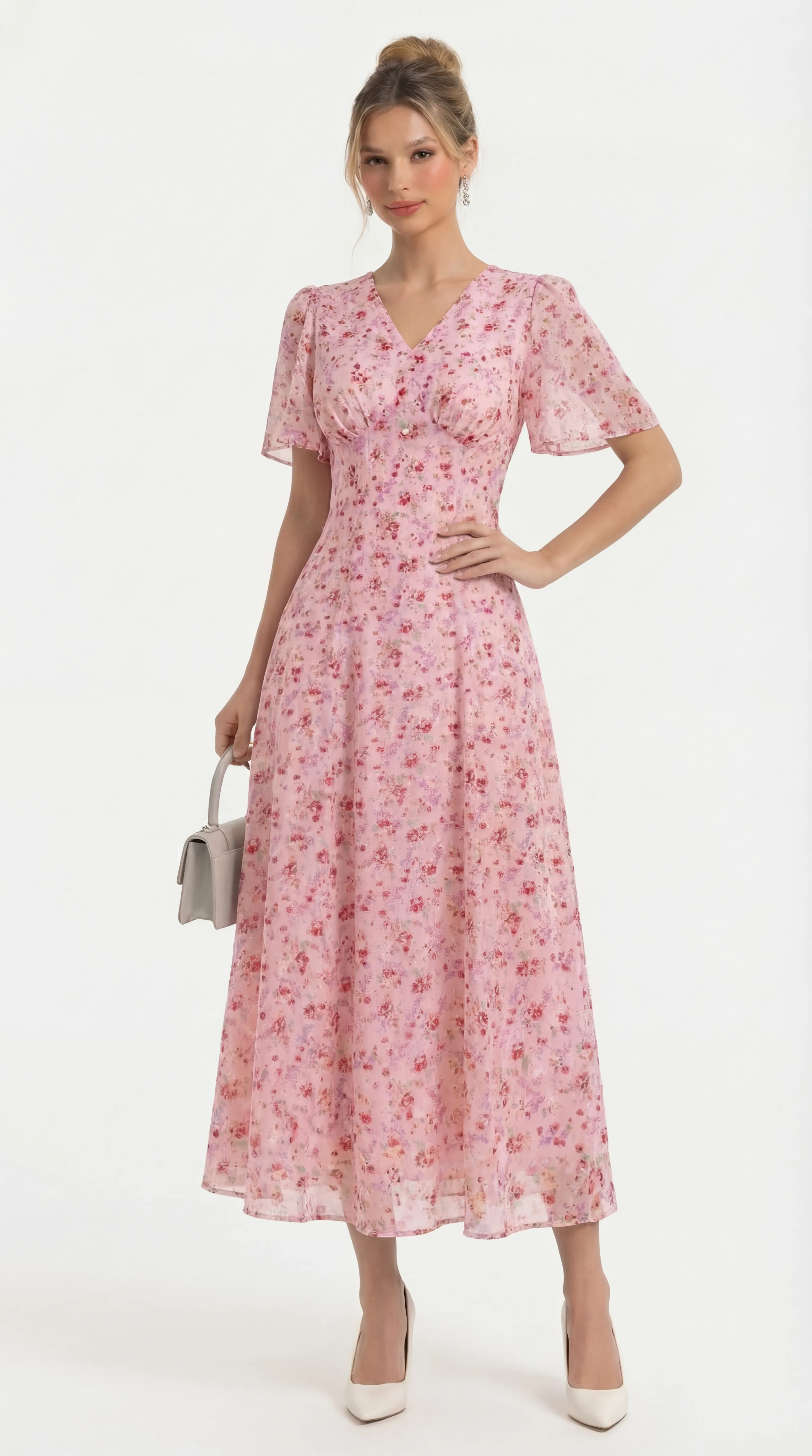 The MDU4886 is a masterpiece of romantic femininity, blending the luxury of floral-textured silk with a sophisticated pearl-trimmed silhouette. With its flattering V-neck and airy flutter sleeves, this pink midi offers a polished and comfortable statement for any high-end occasion.
