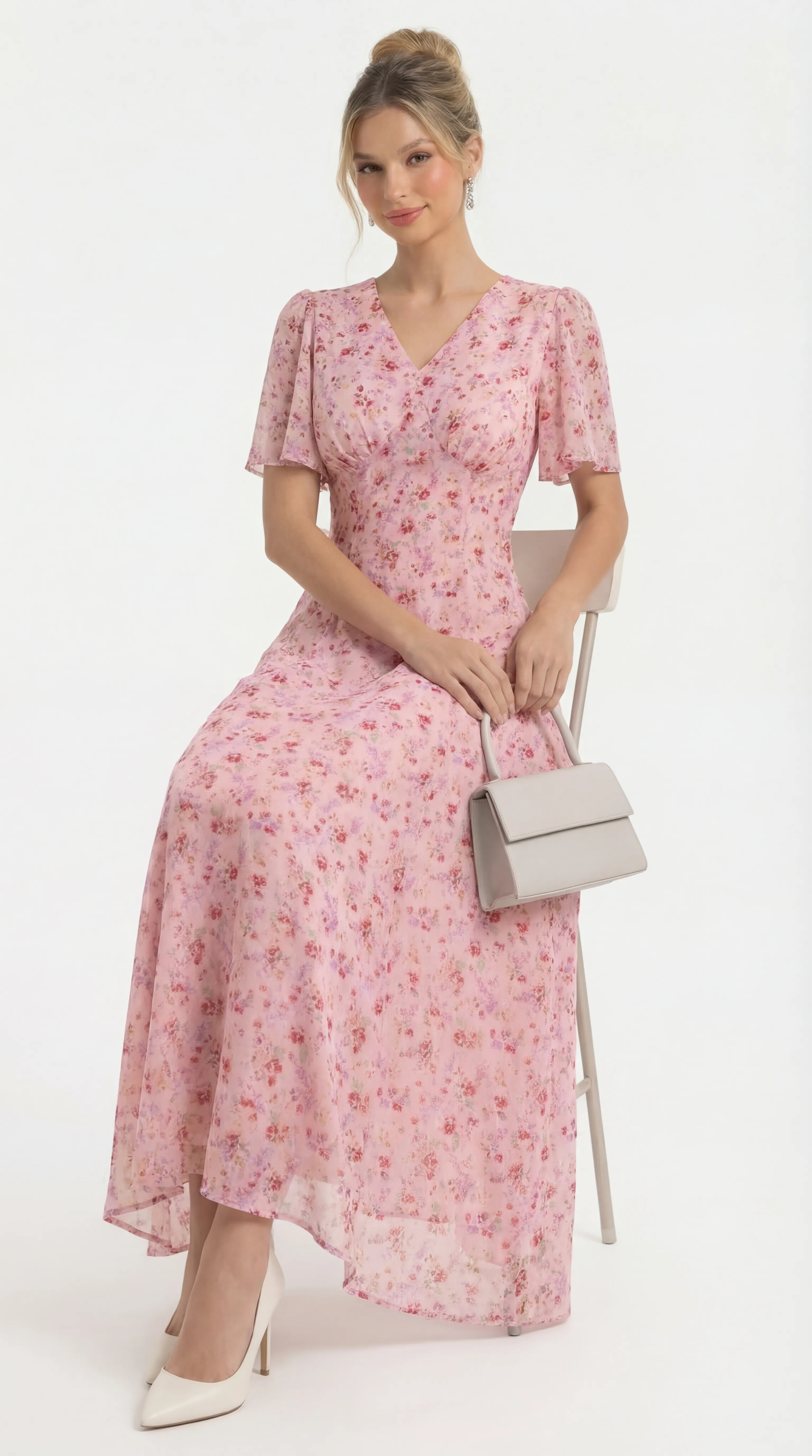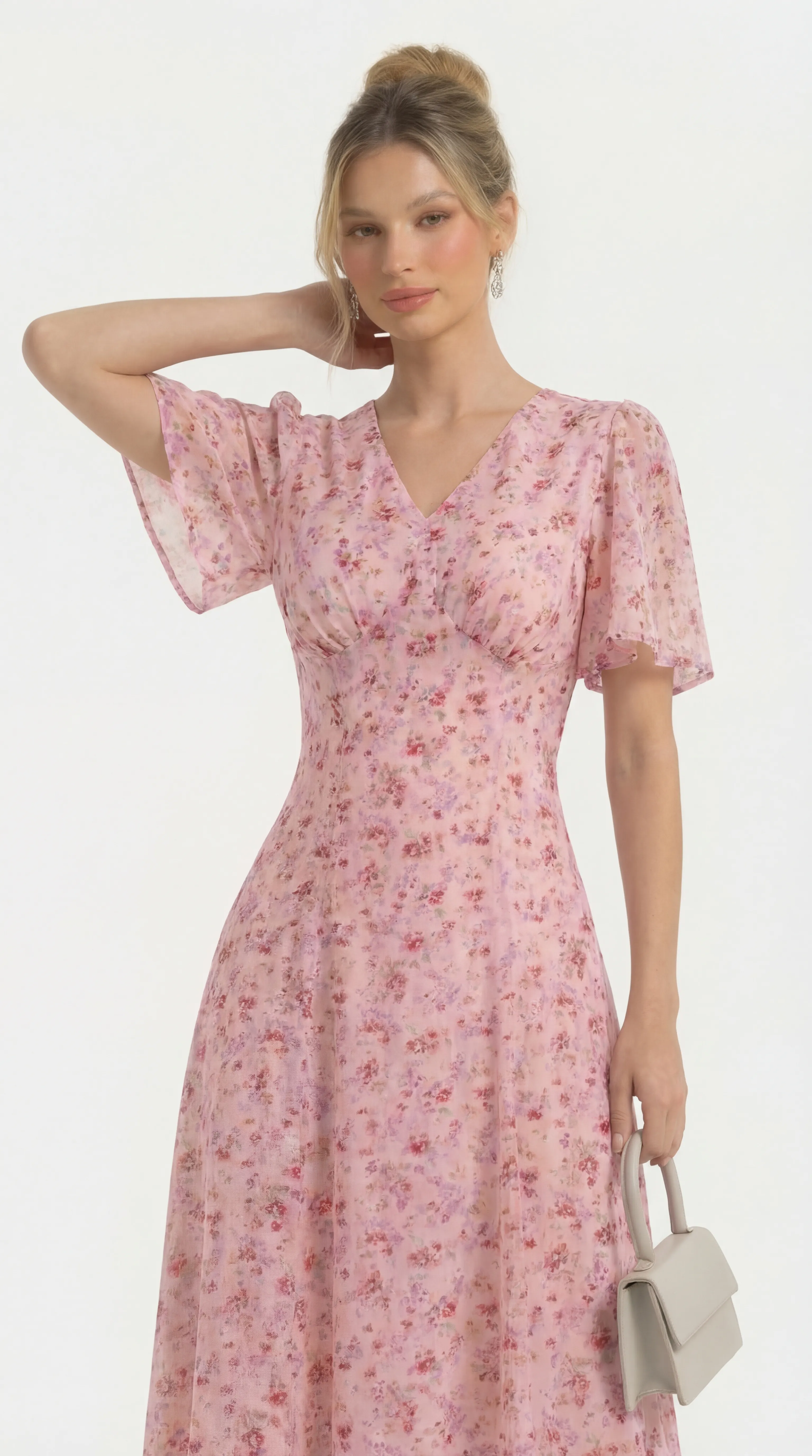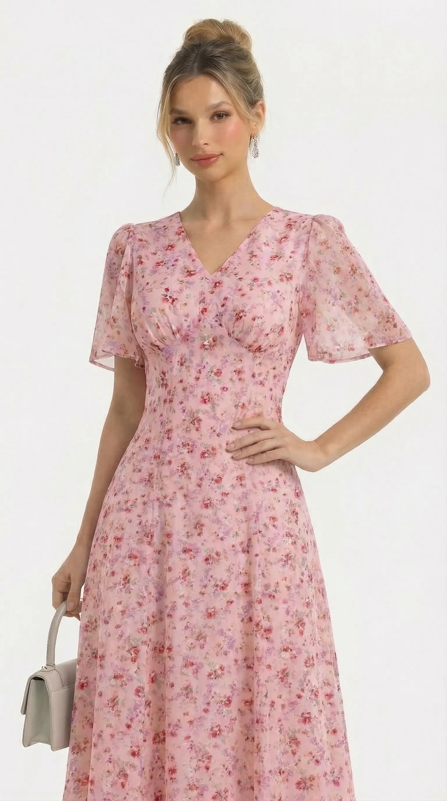 The MDU4886 is a masterpiece of romantic femininity, blending the luxury of floral-textured silk with a sophisticated pearl-trimmed silhouette. With its flattering V-neck and airy flutter sleeves, this pink midi offers a polished and comfortable statement for any high-end occasion.