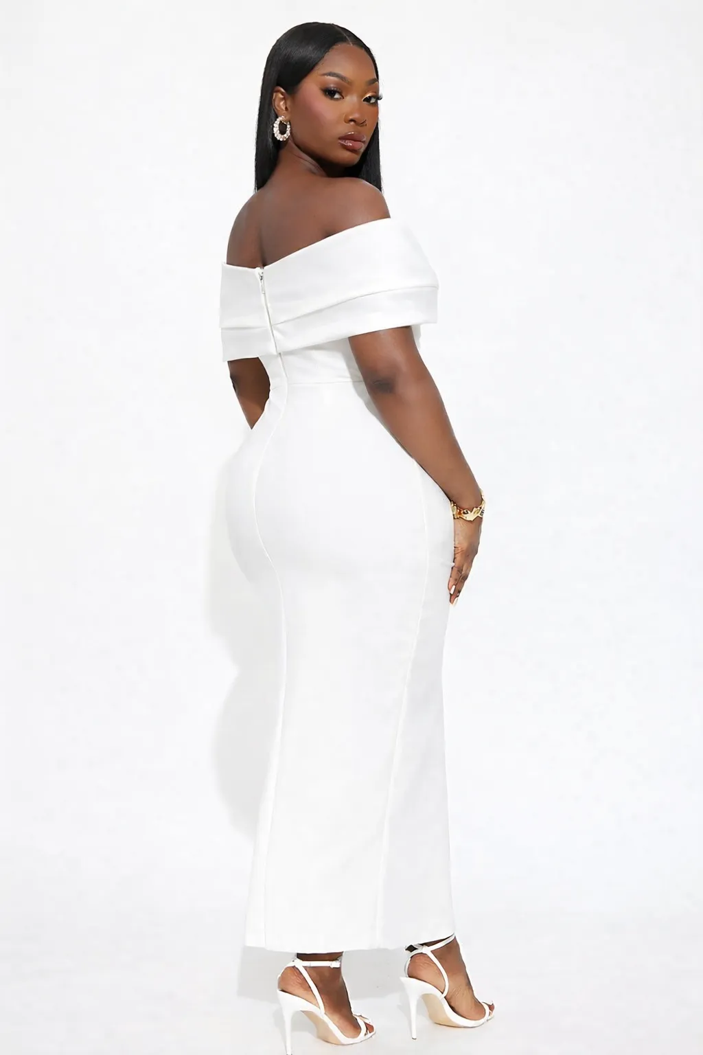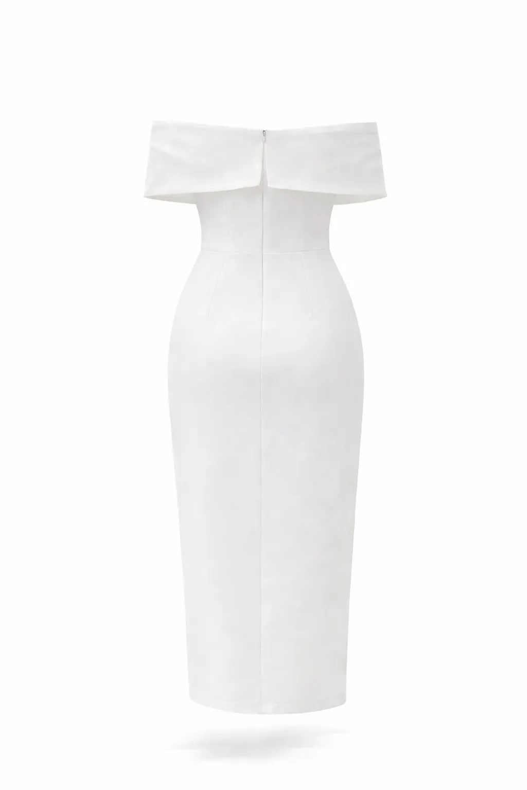 The pure white hue enhances the dress’s clean, sophisticated aesthetic, allowing the texture and structure to shine. The midi length balances elegance and modernity, making this design effortlessly versatile for elevated occasions.