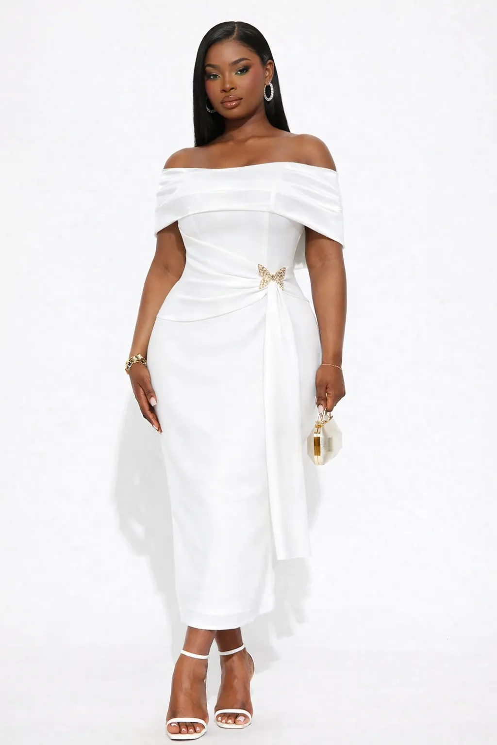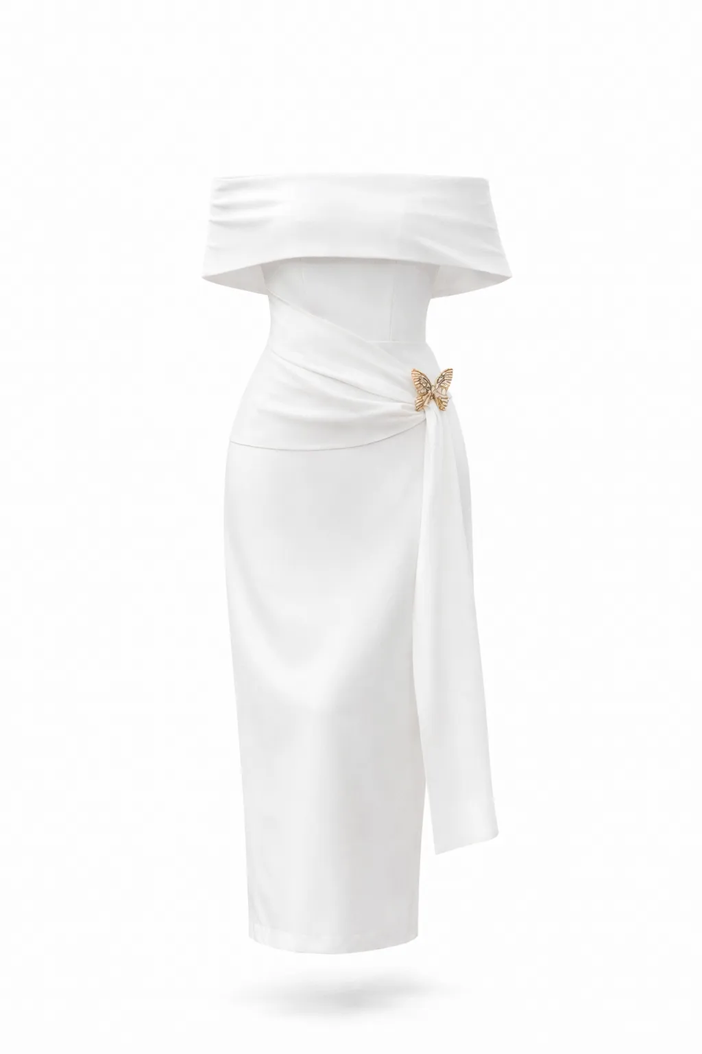 An off-shoulder white midi dress crafted from premium Italian mango fabric, featuring elegant draped detailing and a luxurious gold butterfly accent at the waist. Perfect for weddings and refined occasions.