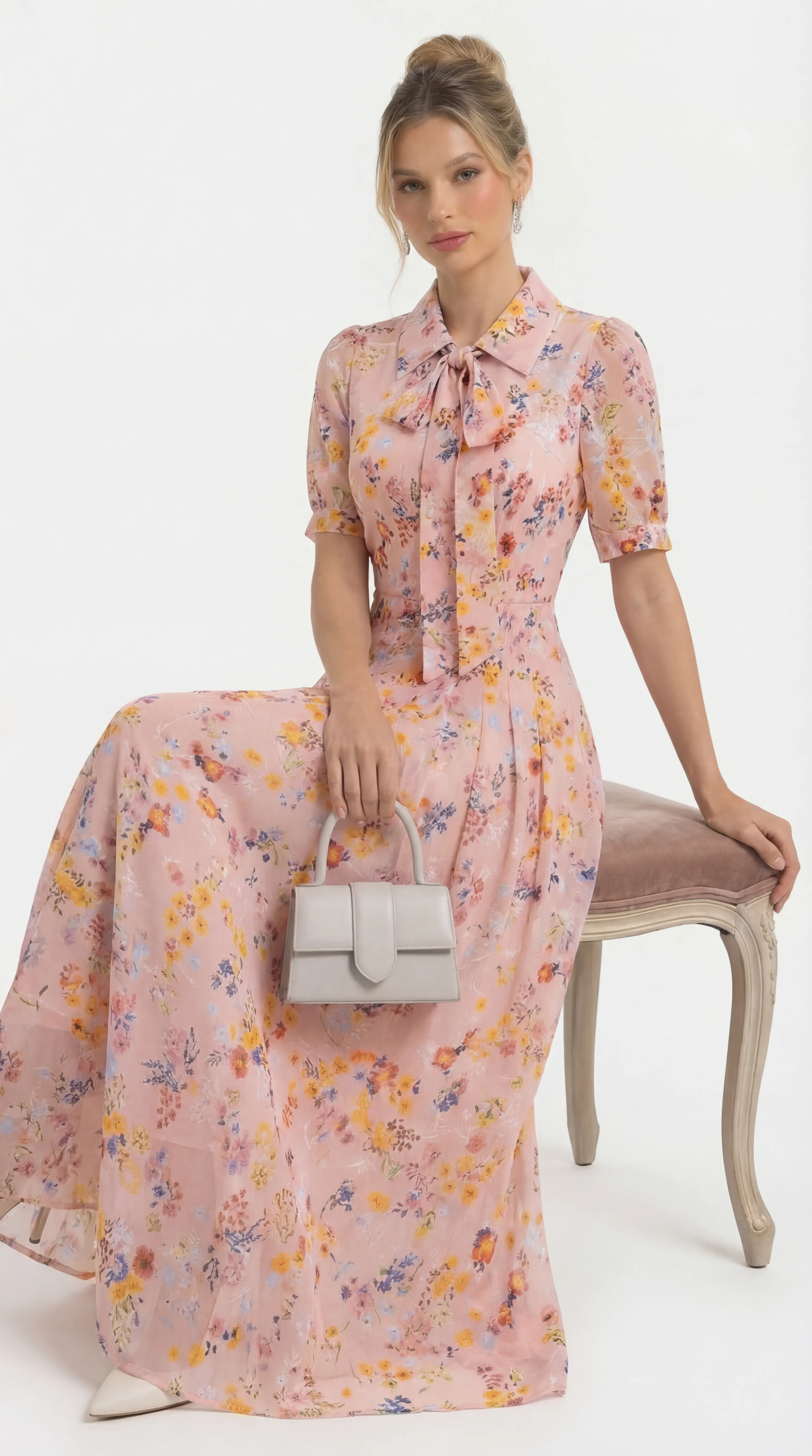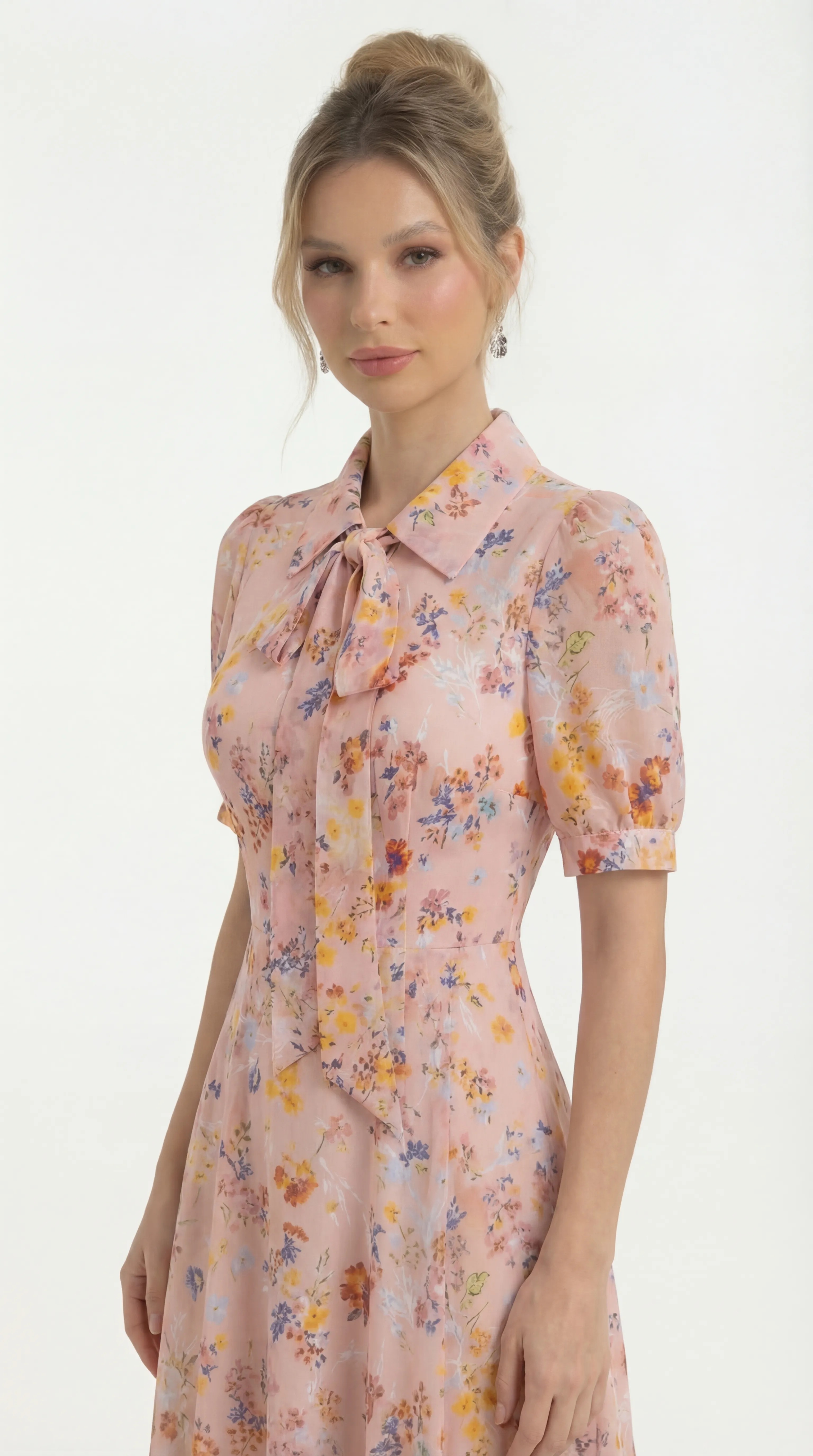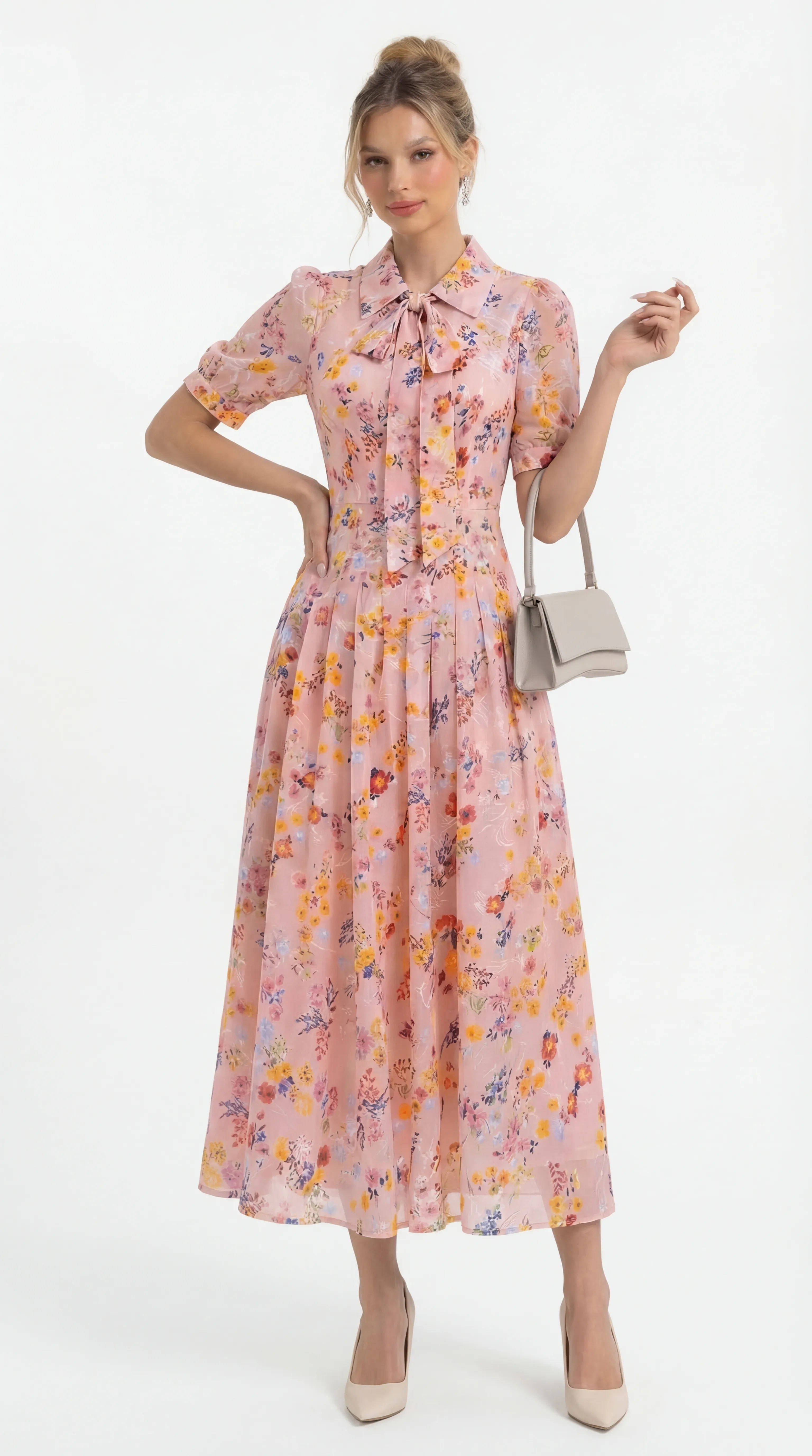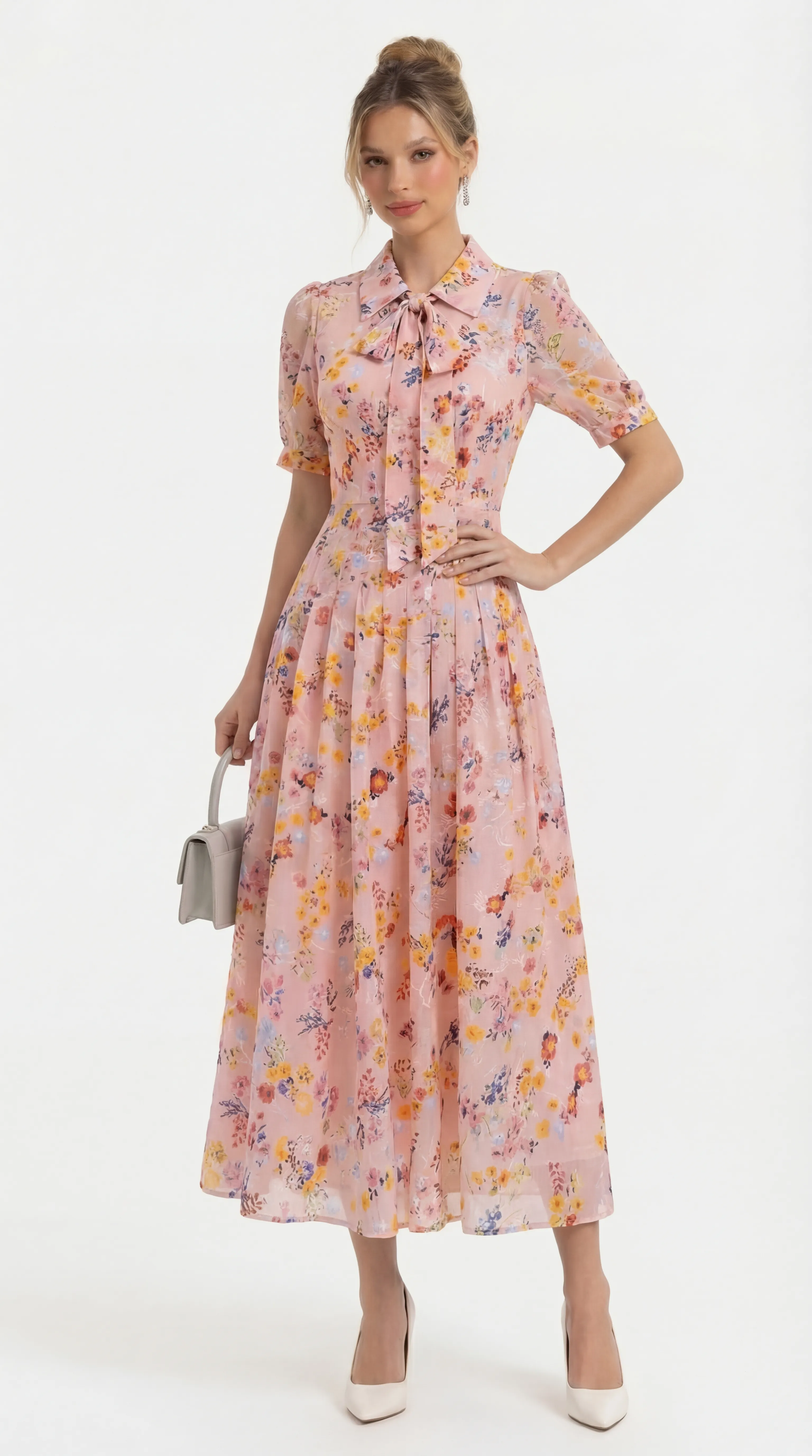 The MDU4840 is a vision of graceful femininity, combining the luxury of pressed silk with artisanal pleating and a charming bow-accented collar. With its romantic puff sleeves and vibrant floral print, this flared midi offers a polished and comfortable silhouette for any high-end occasion.