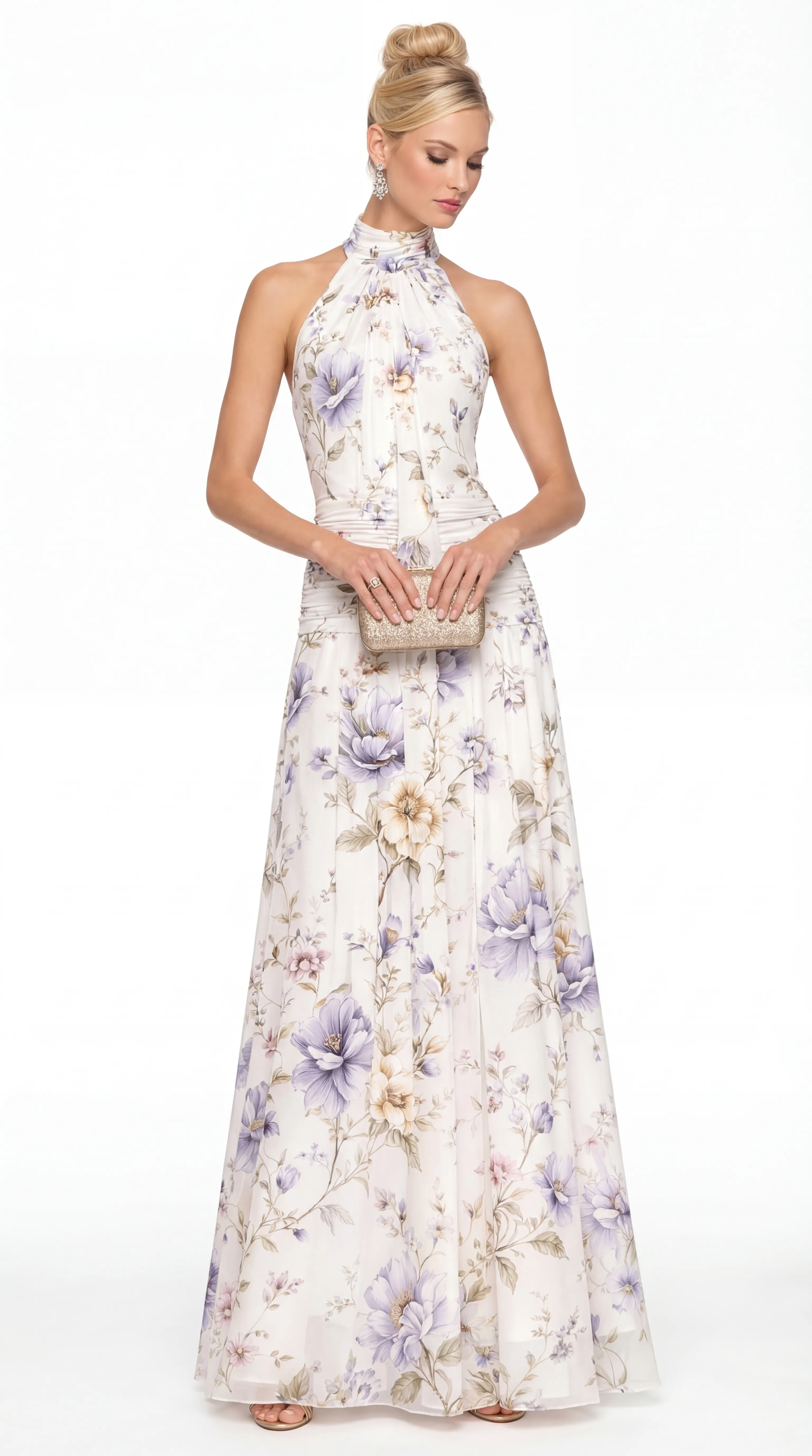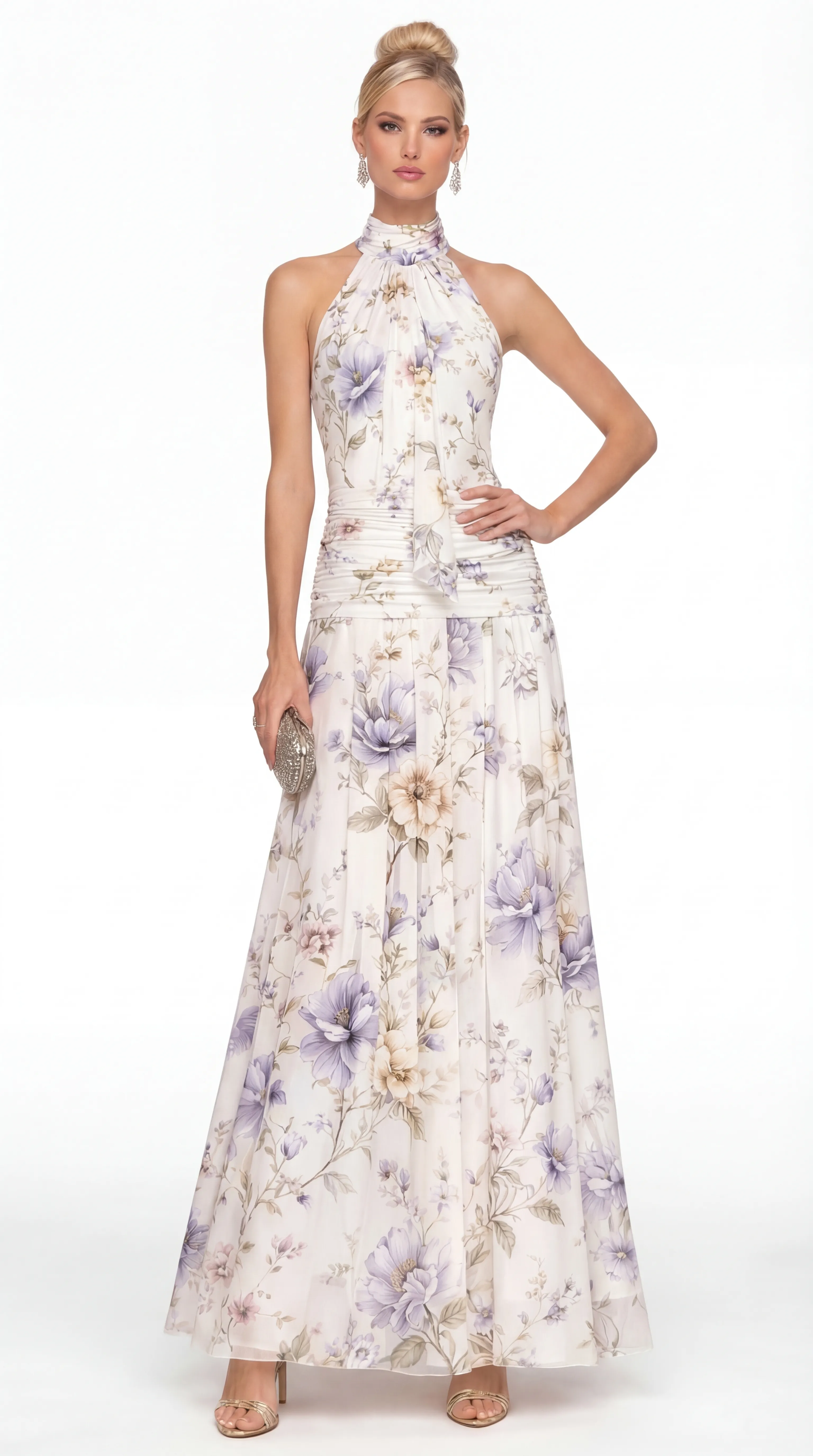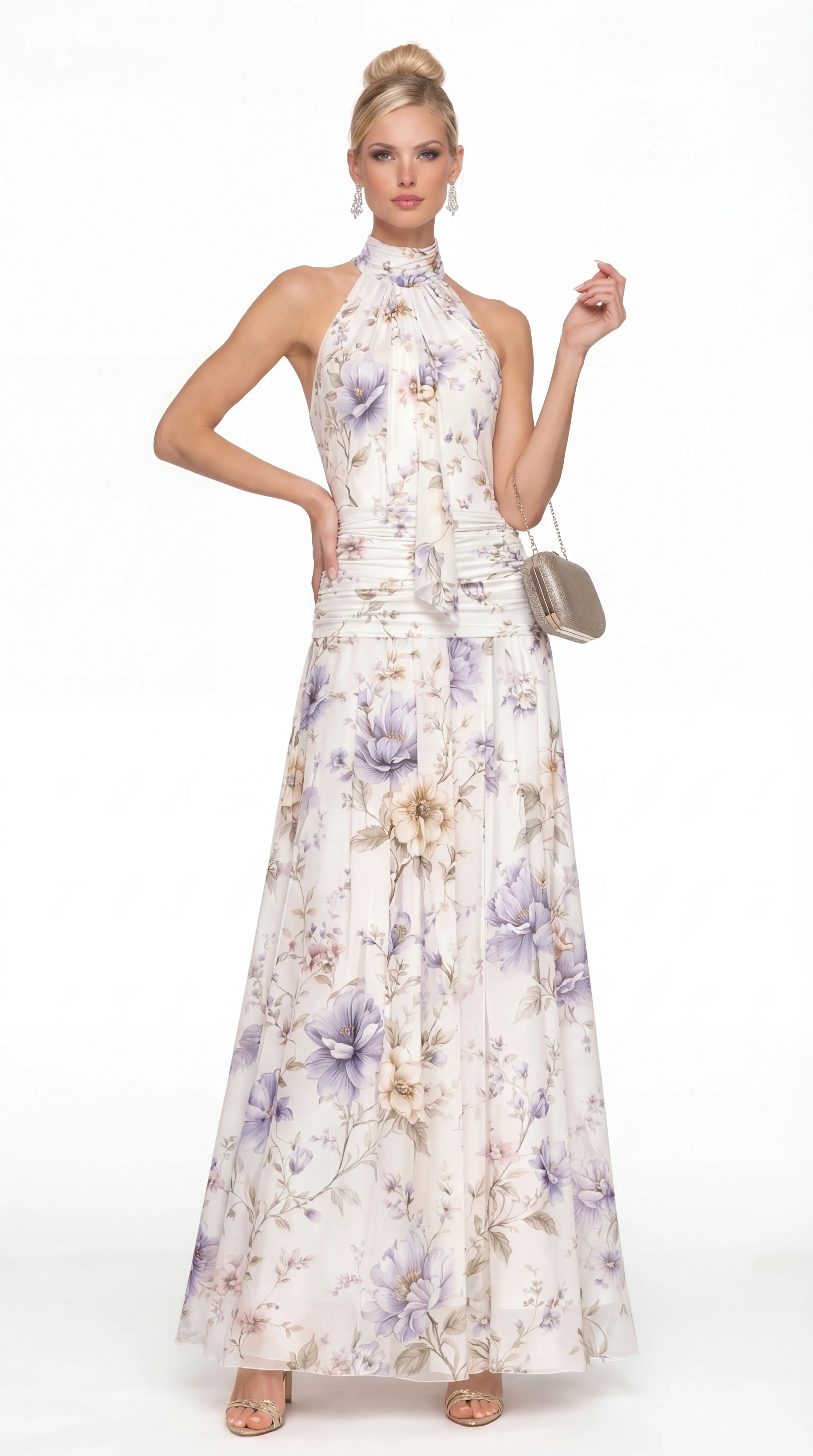 Radiate romance in the MUS472, a luxury floor-length gown crafted from breathable printed tơ silk. With its sophisticated high-neck halter and cinched pleated waist, this lavender floral gown is a timeless choice for any high-end formal spring occasion.
