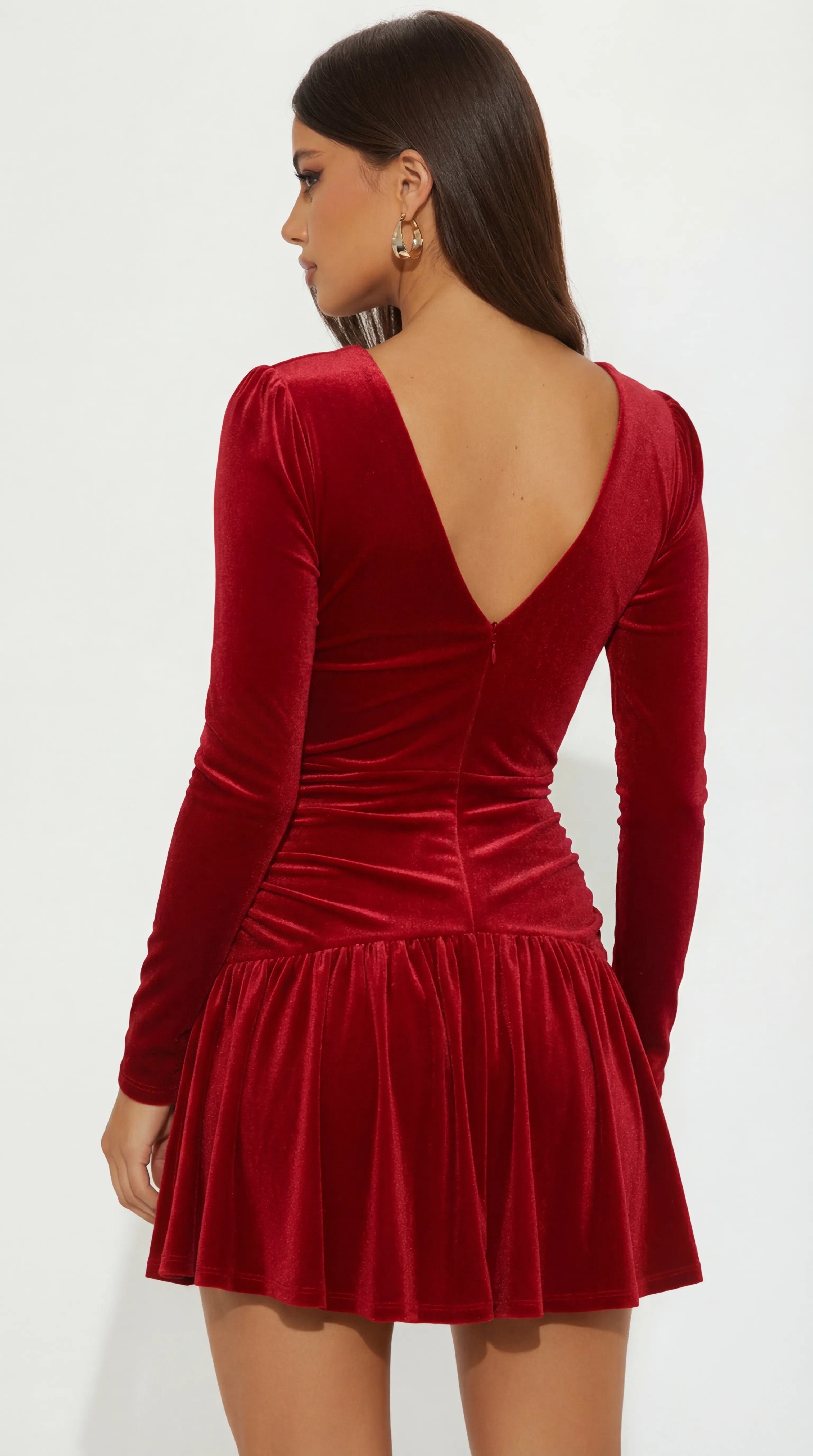 The waist is further defined by a 5cm elasticated band on the left side, providing a comfortable yet cinched silhouette. For a seamless look, a discreet "teardrop" zipper is integrated into the side seam. The skirt features asymmetrical ruching that flows into a playful flared hem, while the back hip area mirrors the ruched detailing to ensure a cohesive and elegant profile from every angle. Long, slim-fit sleeves complete the look, making it a perfect choice for festive parties, romantic dates, or high-end social events.