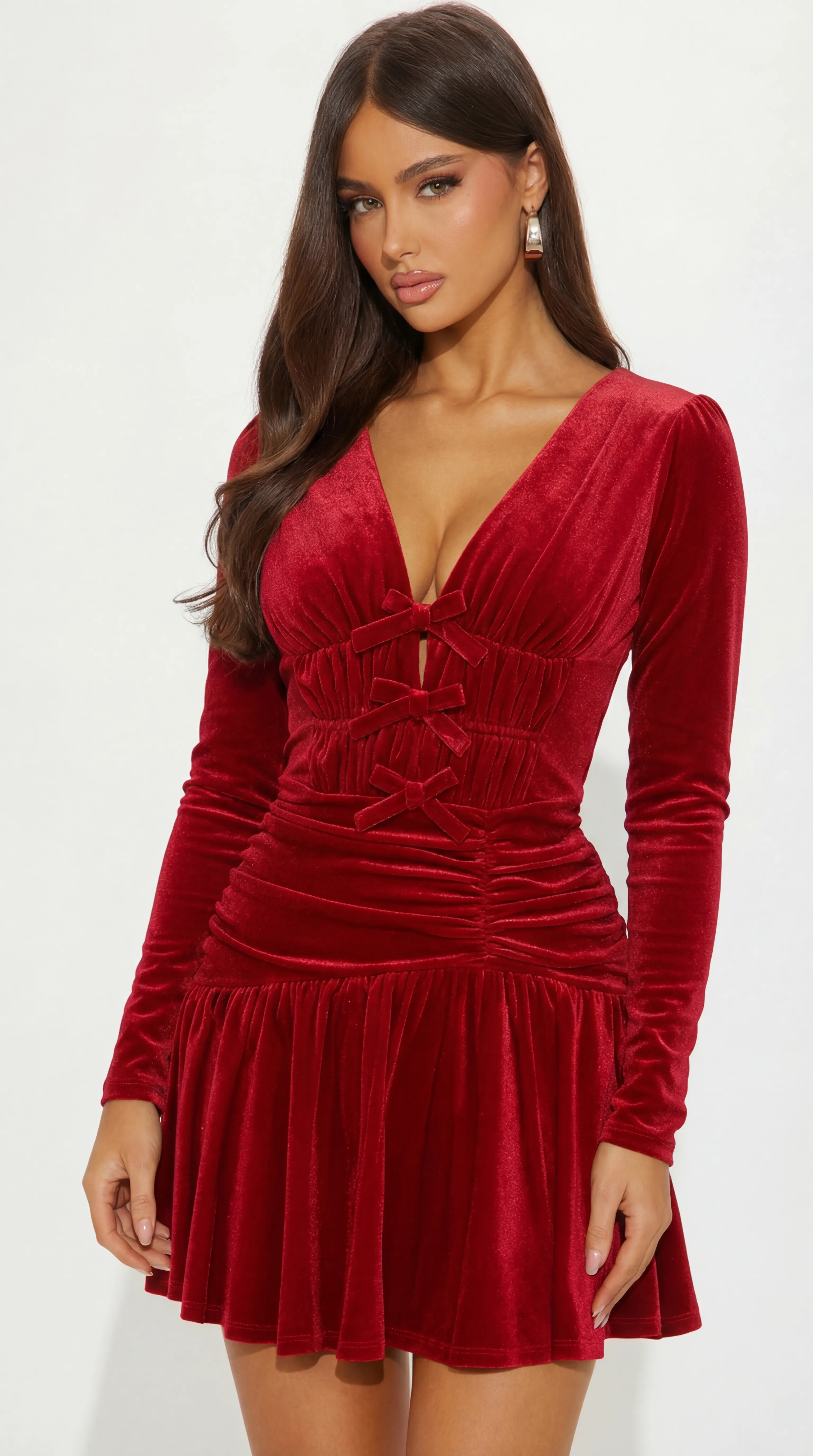 The MUS349 is a luxurious velvet mini dress defined by its romantic bow embellishments and intricate elasticated smocking. With a comfortable stretch fit and a hidden side zipper, it offers a refined and glamorous silhouette for any special occasion.