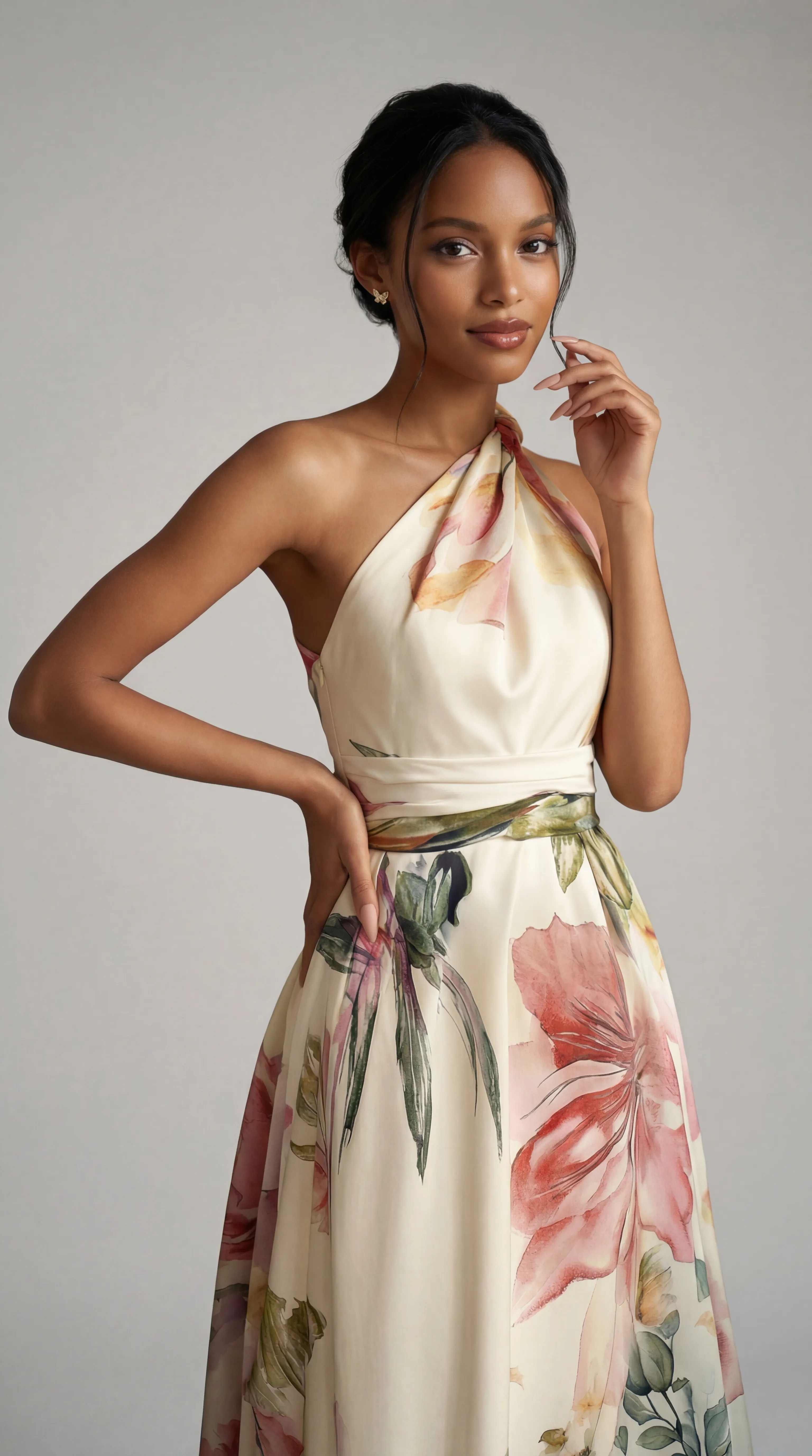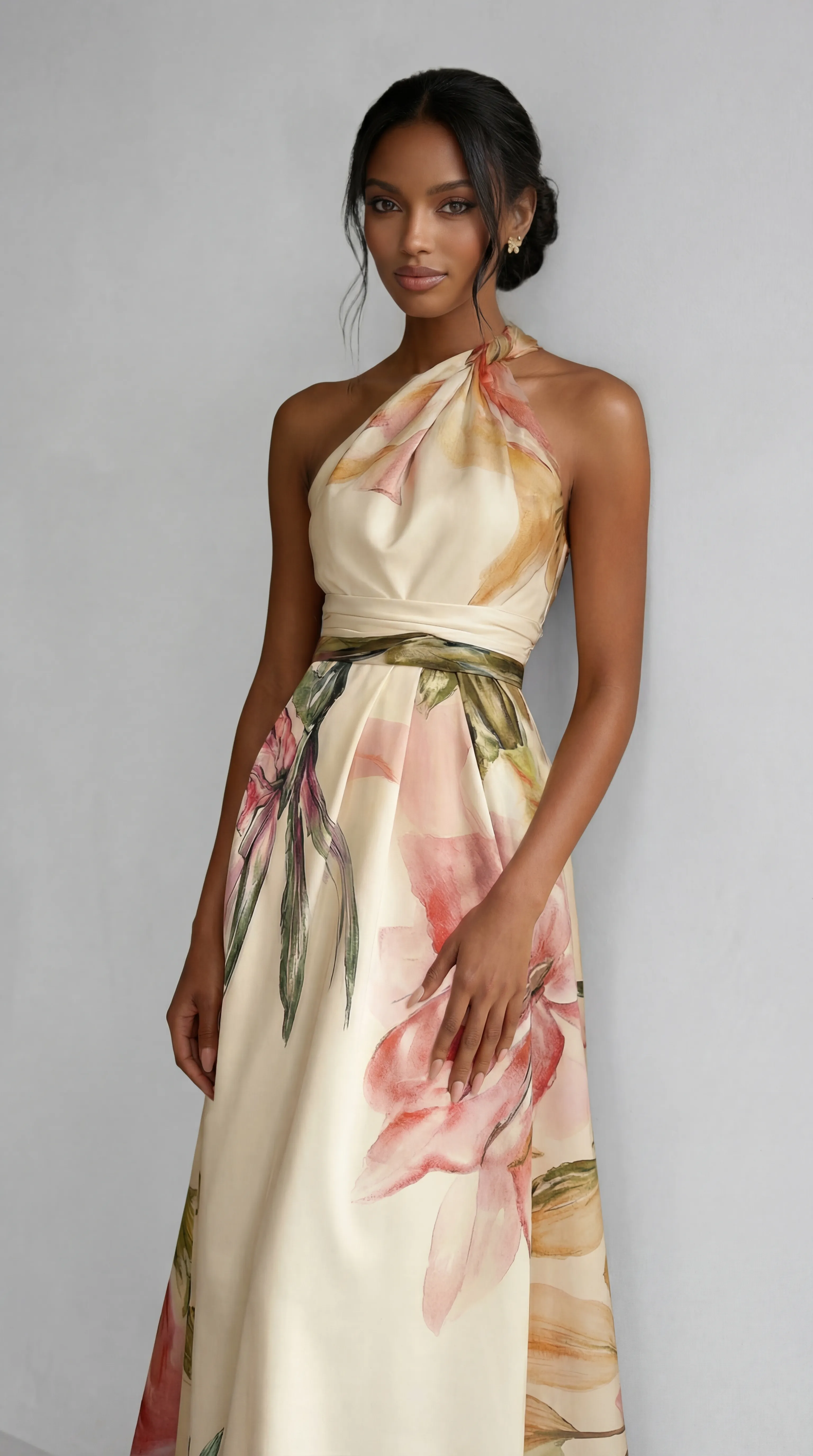 Experience modern glamour in the MUS551, a luxury gown that combines the softness of elastic silk with a bold botanical vision. With its unique twisted halter neckline and vibrant, oversized floral motifs, this gown offers a statuesque and deeply romantic silhouette for your most memorable occasions.