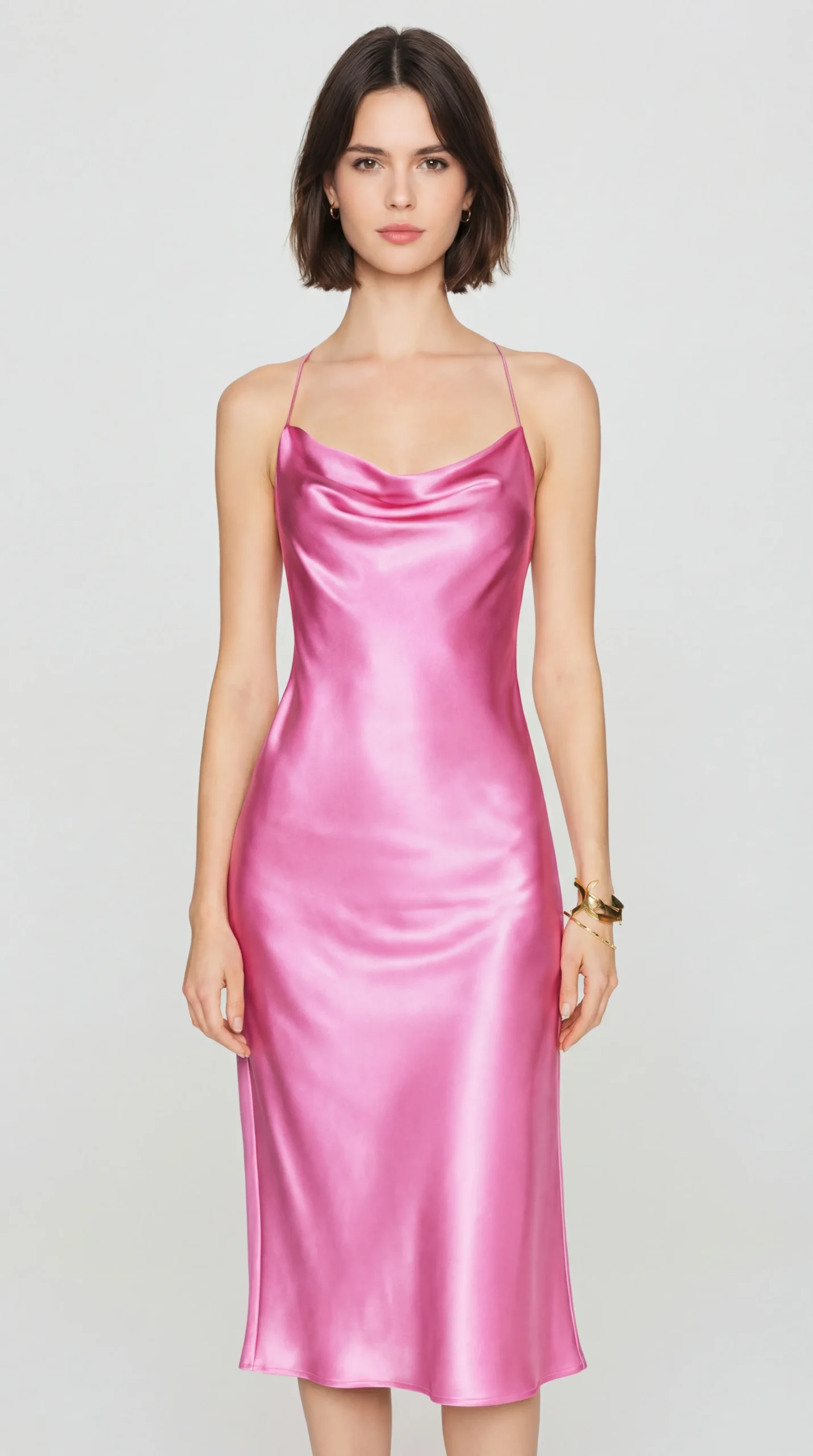 Tailored Silhouette: Designed with a modern slip-dress cut that flows easily over the body while utilizing strategic waist darts to subtly define the figure.