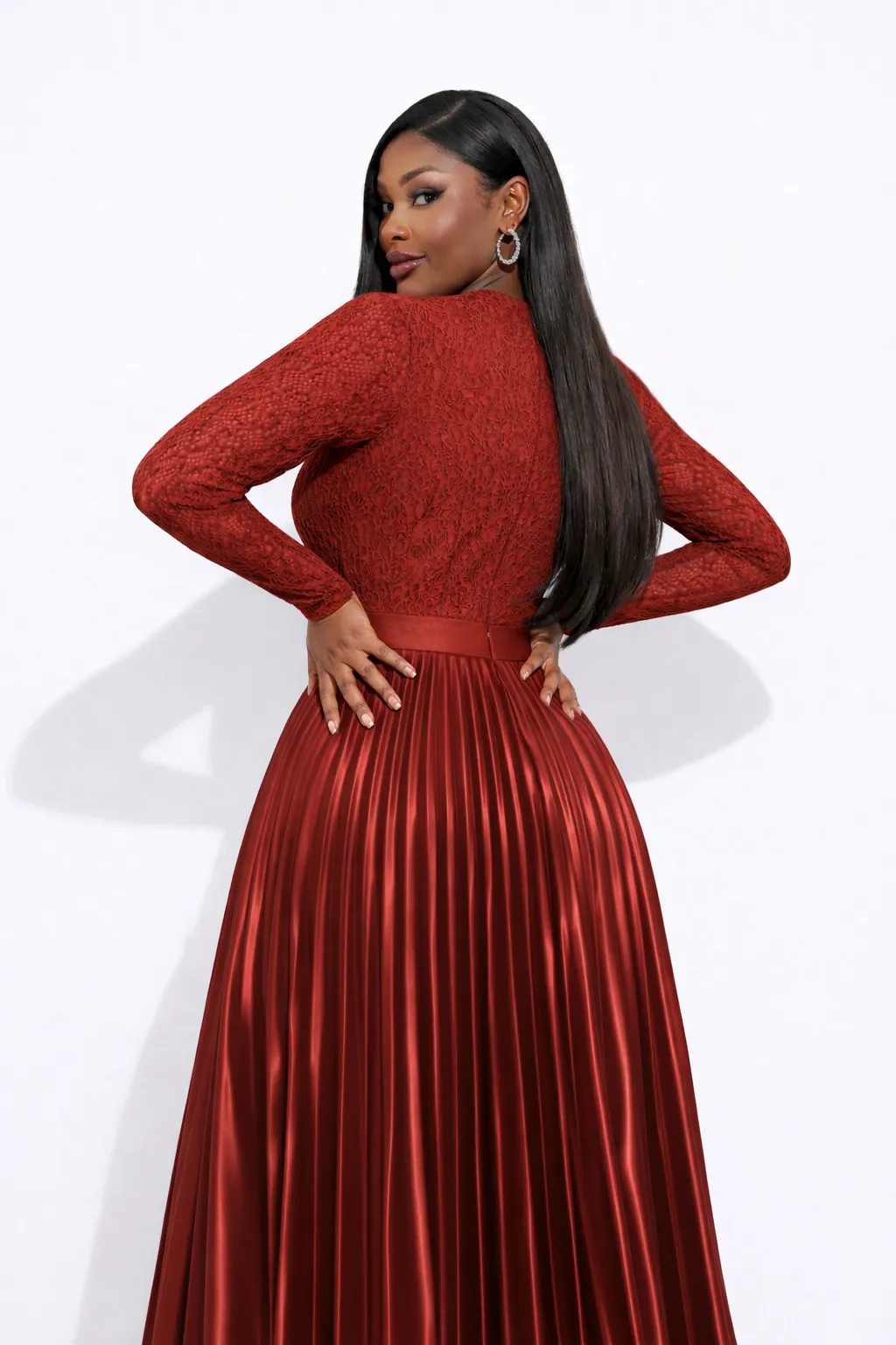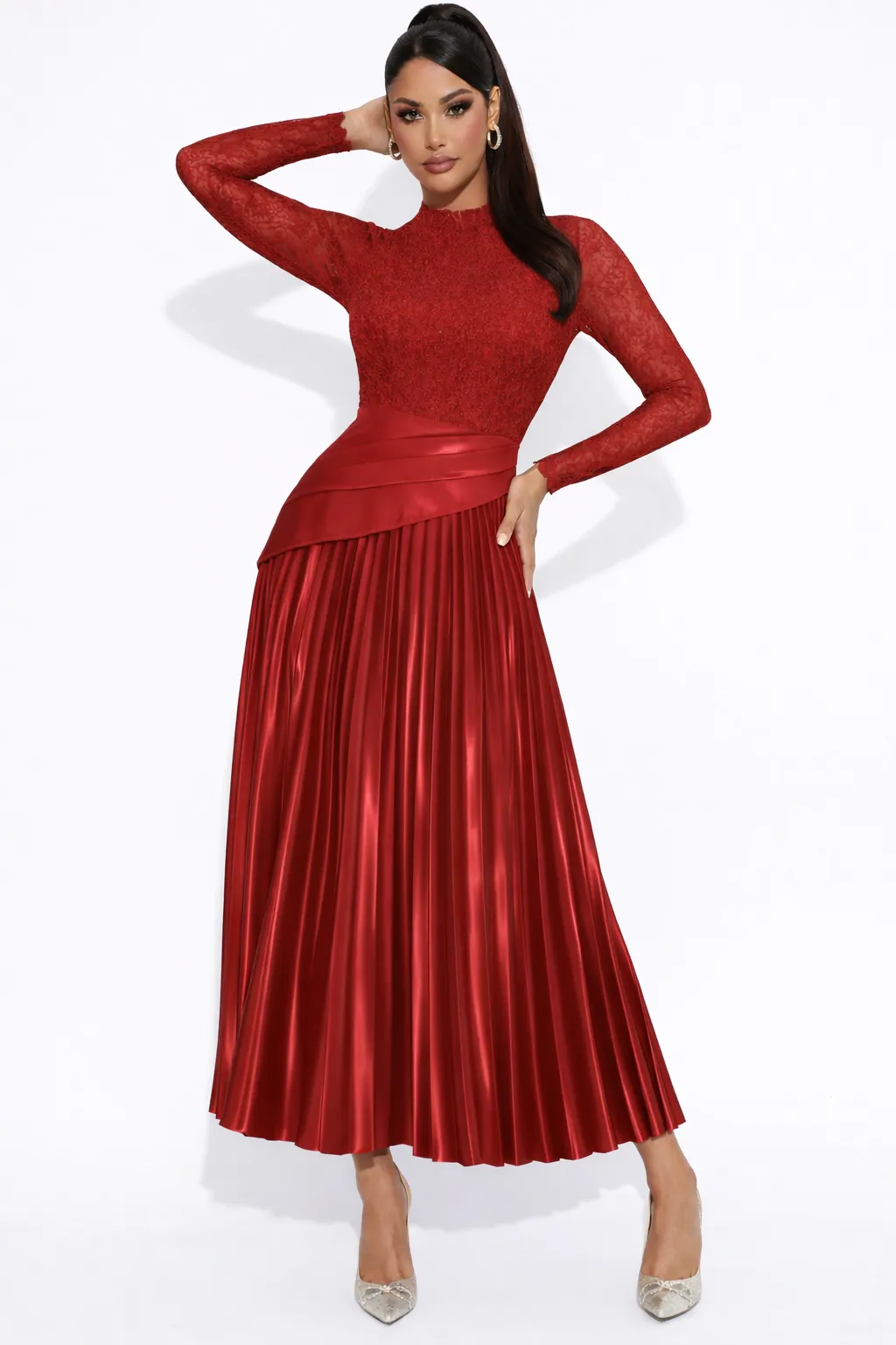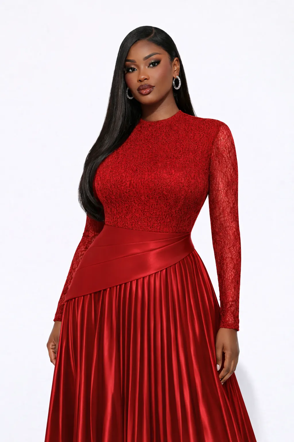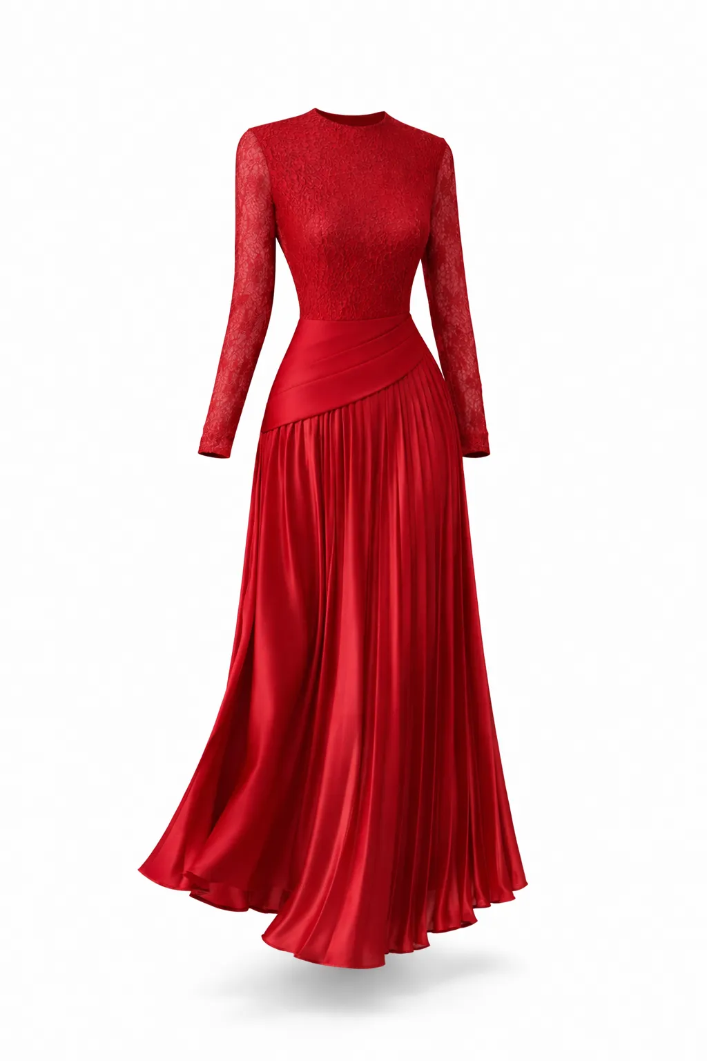 SCARLET LACE & PLEATED SATIN MAXI – MODERN ELEGANCE | MDU5794