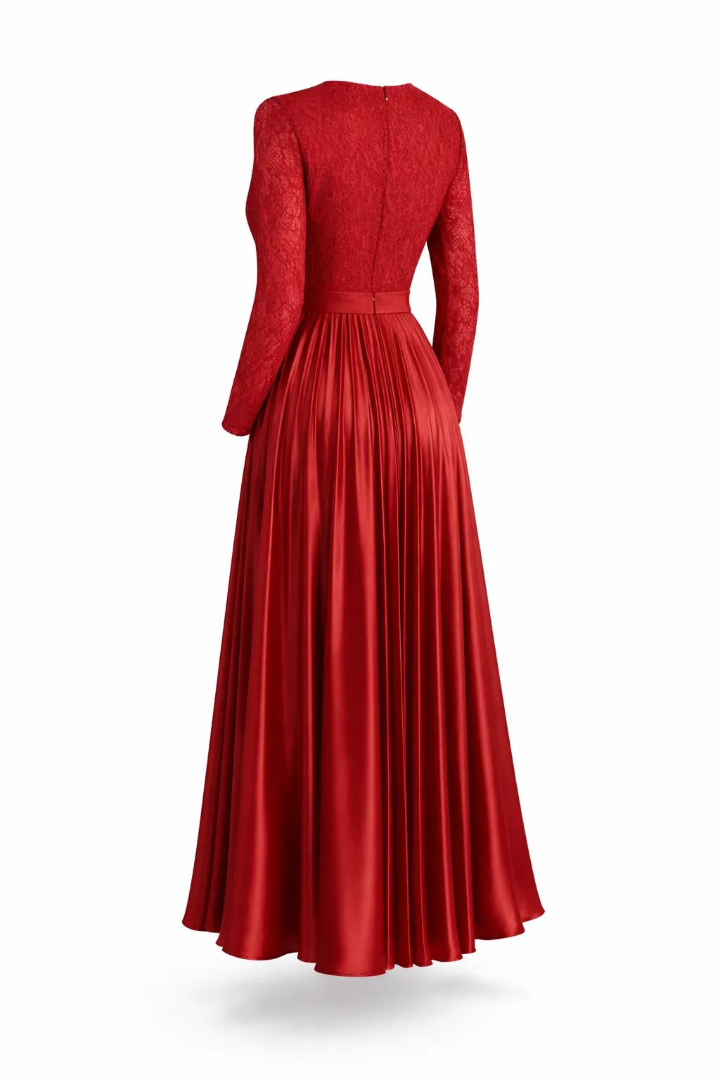 The MDU5794 combines romantic lace craftsmanship with the dramatic flair of pleated satin. This scarlet red maxi dress, featuring a sophisticated waist cincher and long sleeves, is perfect for making a grand entrance at any formal celebration.