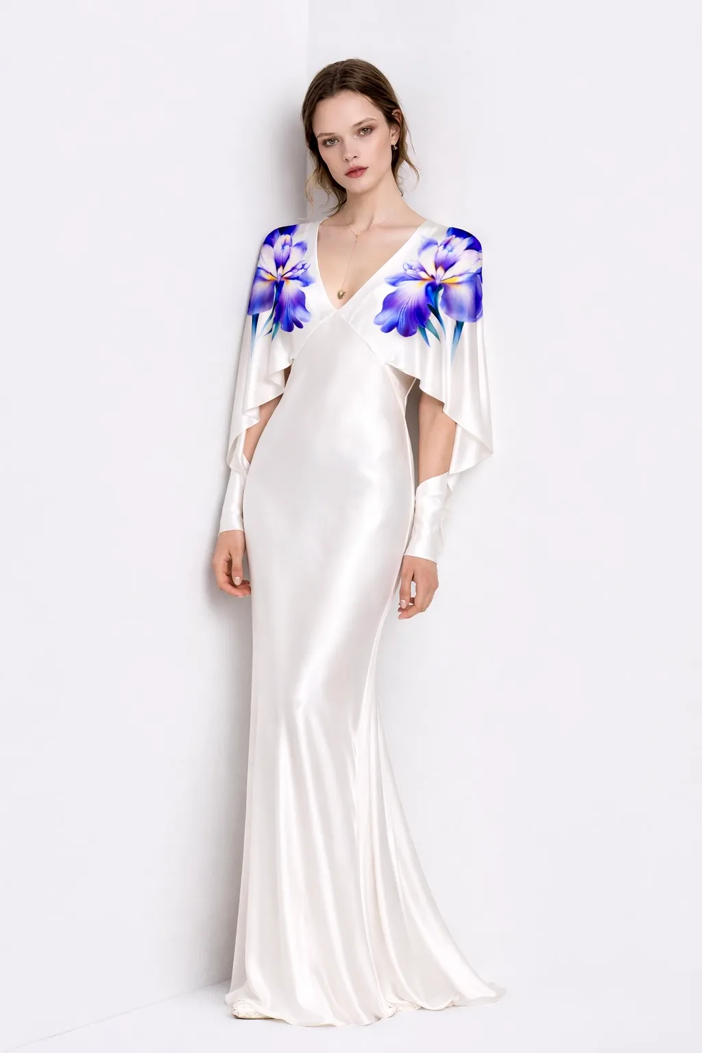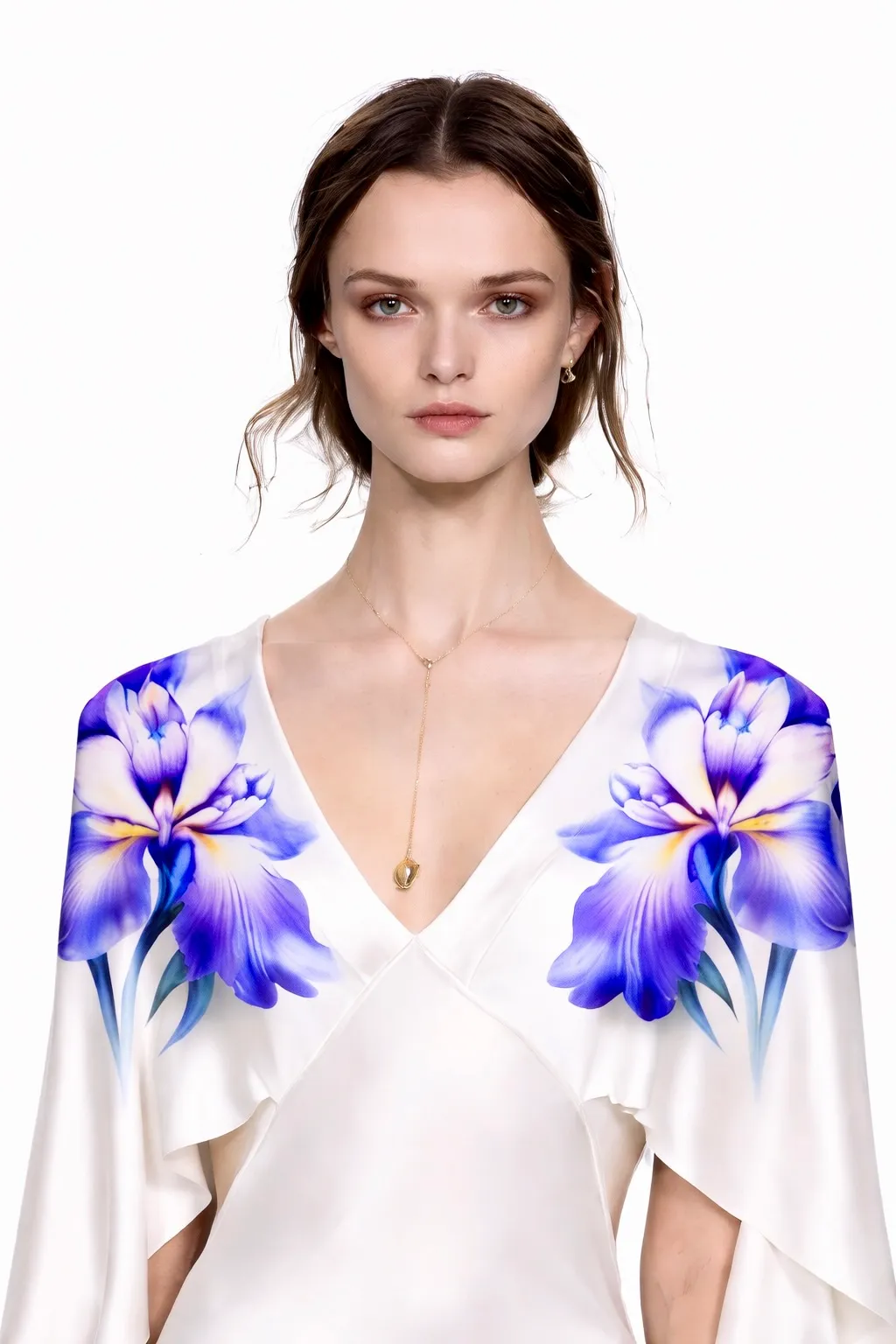 The MUS542 features a graceful V-neckline with a flowing shoulder panel that wraps elegantly from front to back. Crafted from printed silk, this design blends structure and softness for a refined, modern silhouette.
