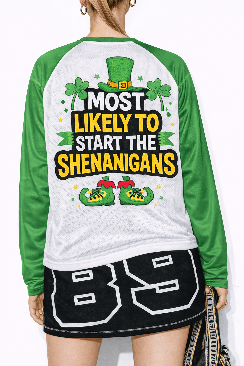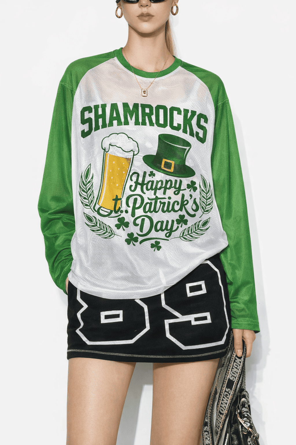 Graphic Artistry: The center front features a large-scale, heat-transfer printed graphic. The design includes bold "SHAMROCKS" varsity typography, a celebratory beer mug illustration, a green leprechaun hat, and "Happy St. Patrick's Day" script.