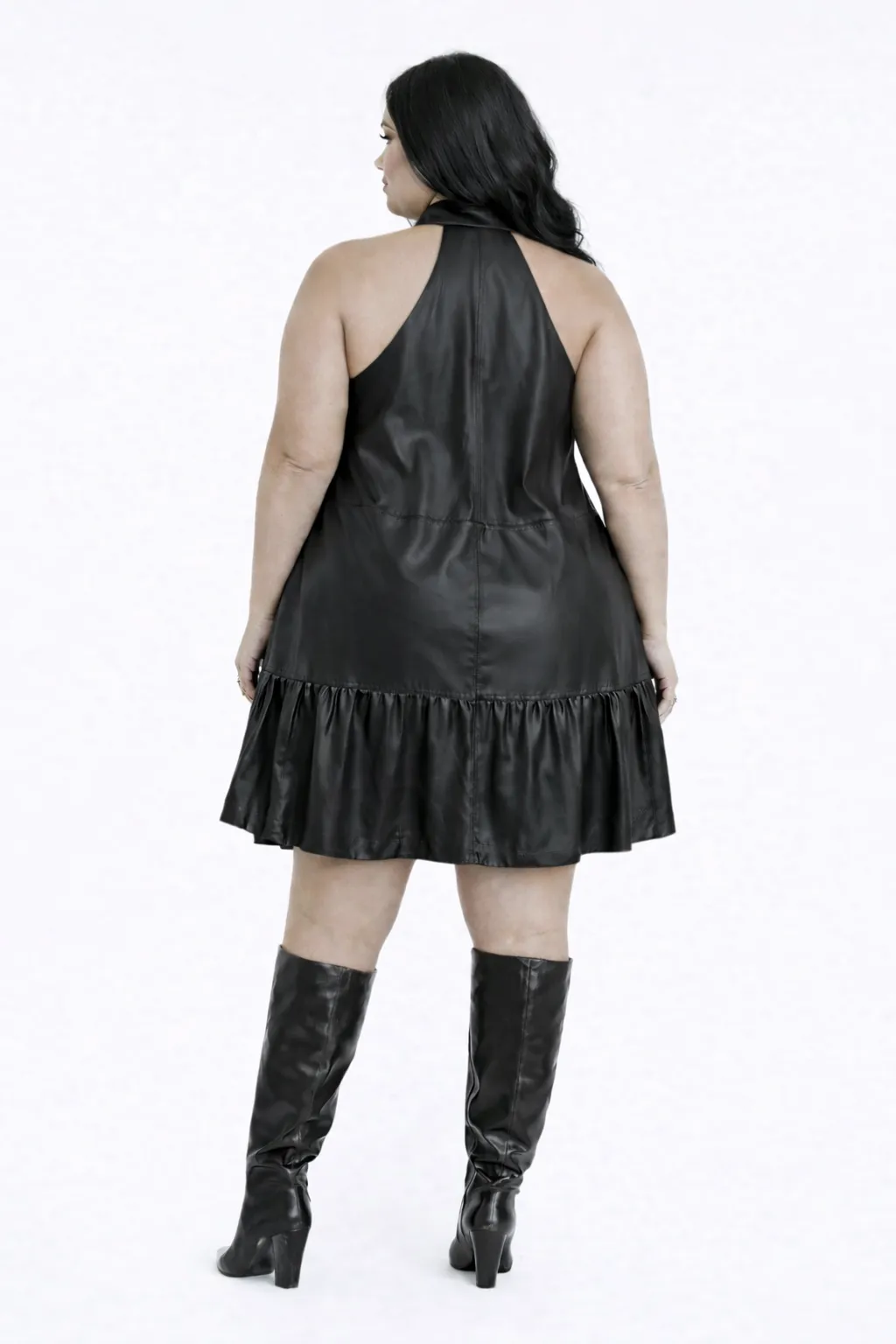Hem Detail: The design is finished with a signature ruched hem (chạy rúm) at the skirt, adding a touch of feminine texture and fluid movement to the bold faux leather.
